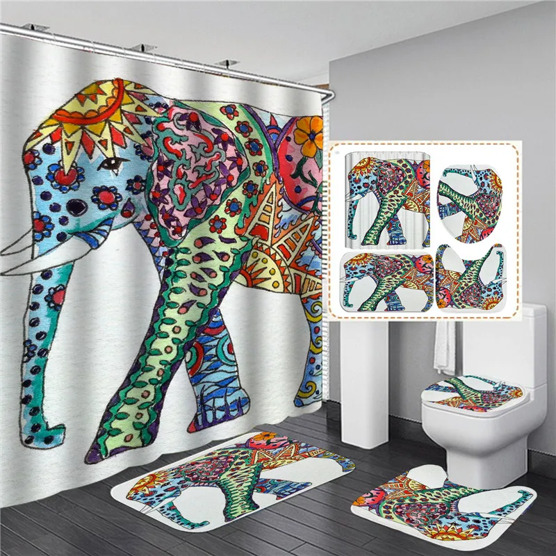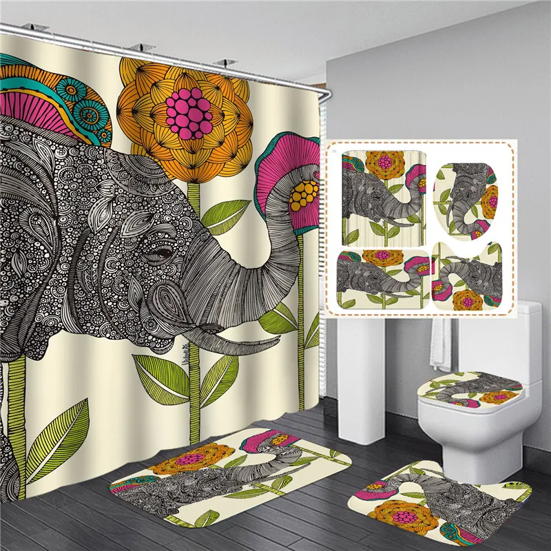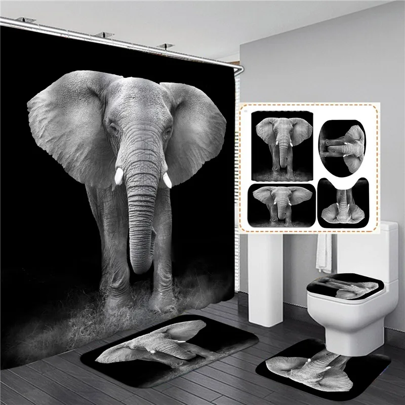 Набор штор для душа с 3D-принтом черного слона, водонепроницаемый экран для купания, фланелевая Крышка для унитаза, коврик для кухни, коврик для ванной
