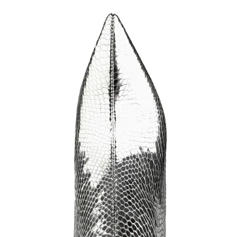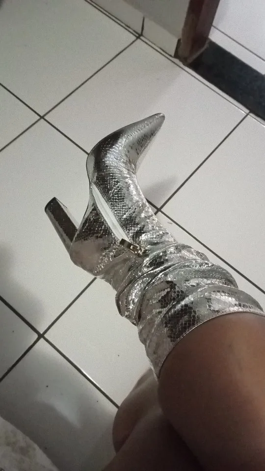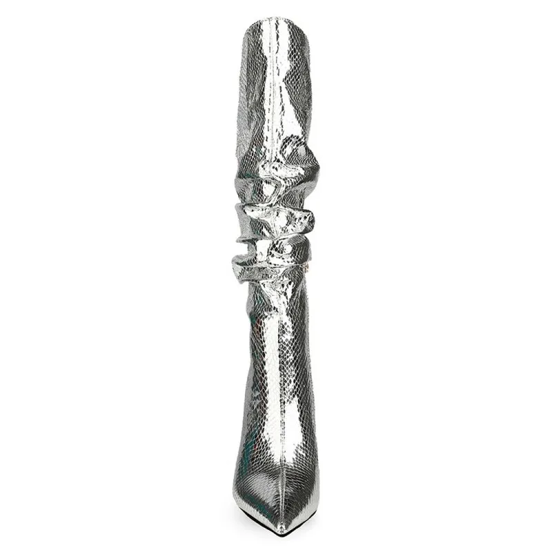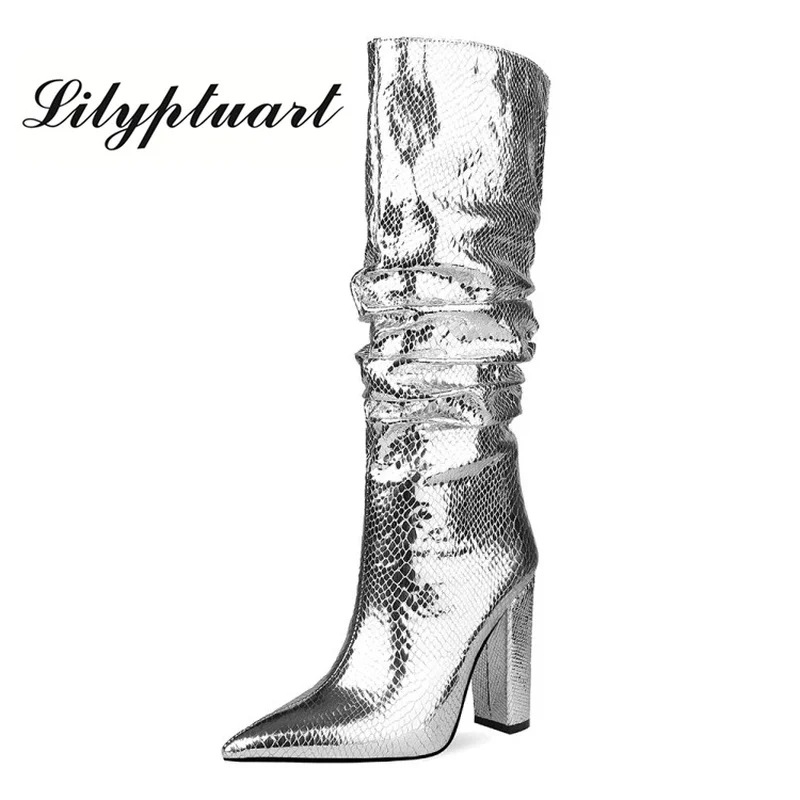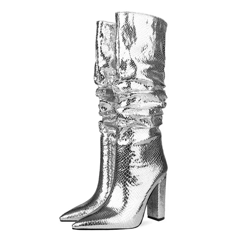 Сапоги женские на толстом каблуке, со складками, серебристые, на молнии