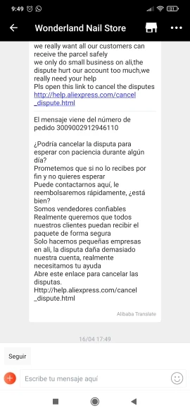 Фатальный, я так и не получил свой заказ, я отправил сообщения продавцу, и он ответил только тогда, когда я открыл спор, он сказал мне закрыть его и подождать дольше, обещав, что если я не получу его, он вернет деньги, но защита закончится, Я перестал спорить, и продавец больше не отвечал ни на одно сообщение, к счастью, я связался со службой поддержки и получил возмещение