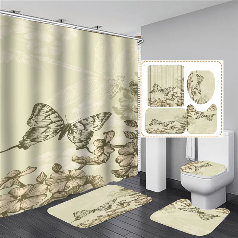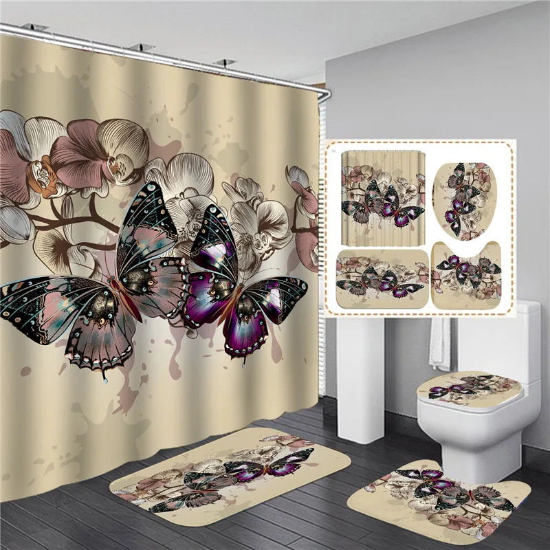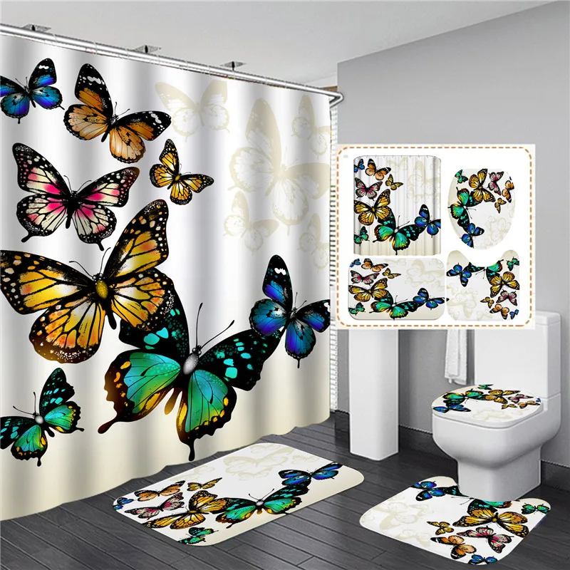 Набор занавесок для душа с большими бабочками и цветочным принтом, элегантная фланелевая крышка для унитаза 3D, нескользящий кухонный коврик, ковер, домашние ковры
