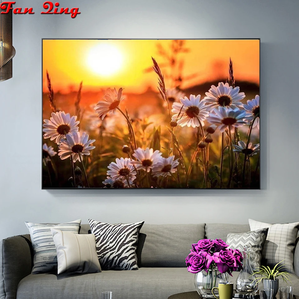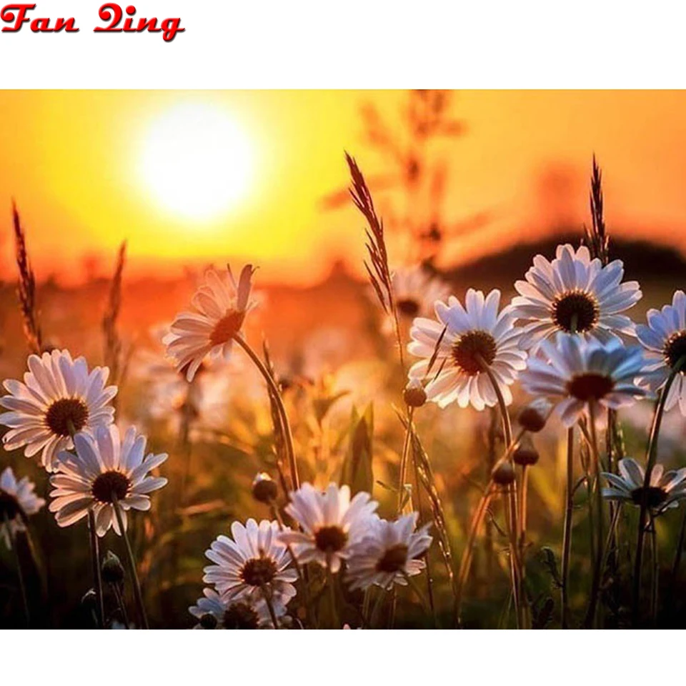 Полностью квадратная Алмазная Картина Закат картинка с ромашкой вышивка круглые алмазы мозаика картины дикий цветок естественное украшение
