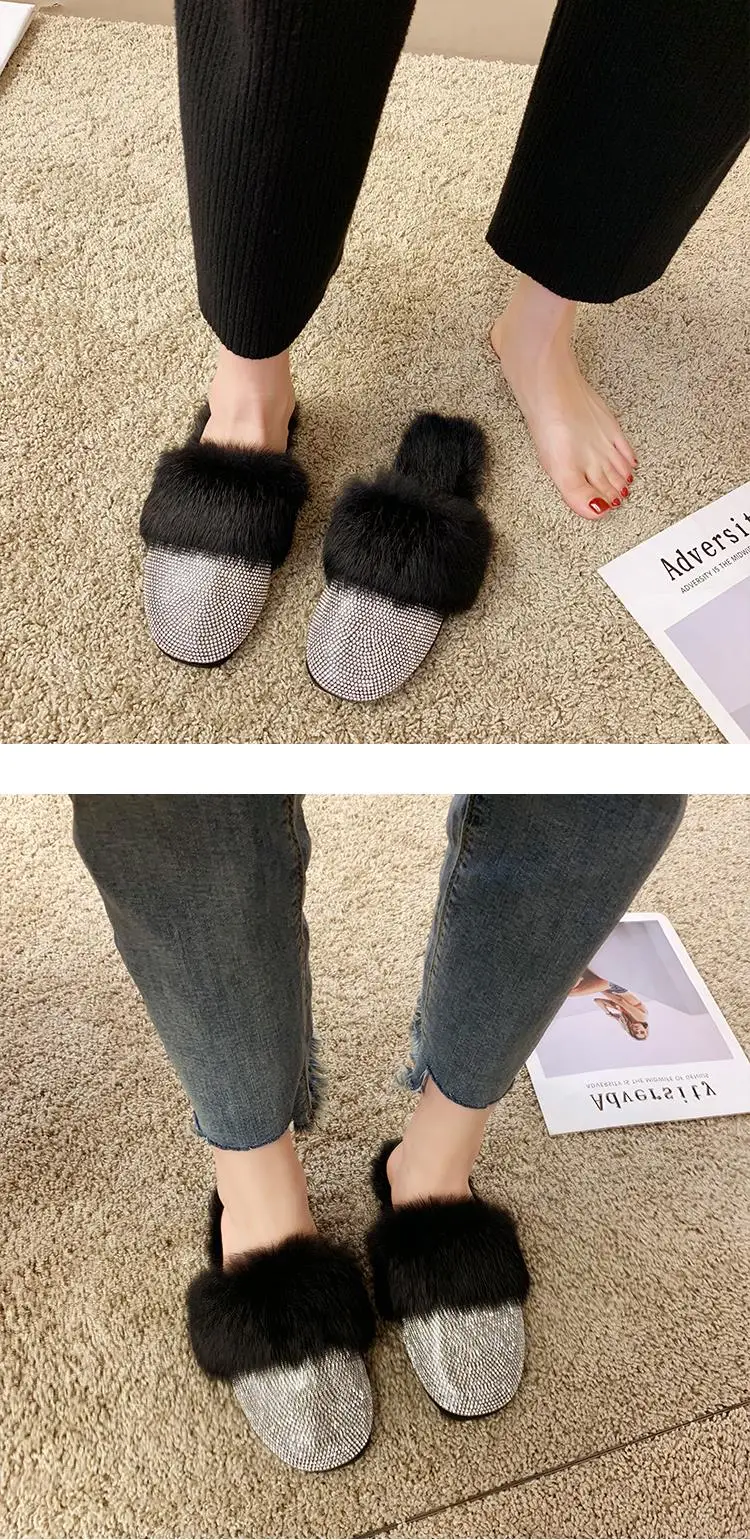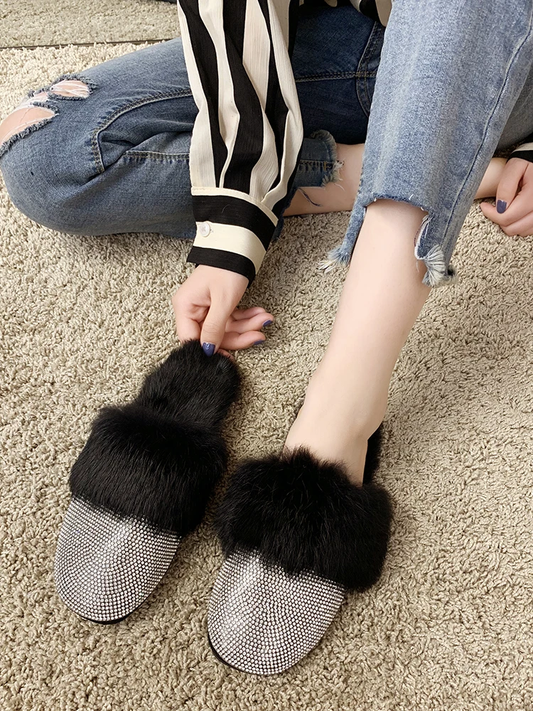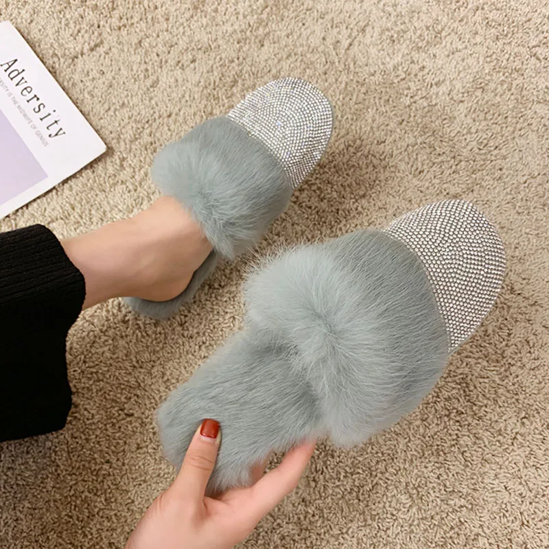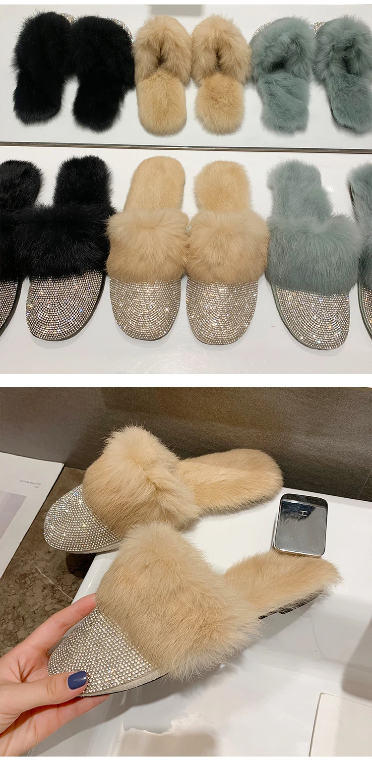 Женские дизайнерские туфли с круглым носком, роскошные женские меховые шлепанцы с кристаллами, мюли со стразами, слипоны, обувь на плоской подошве, 2020