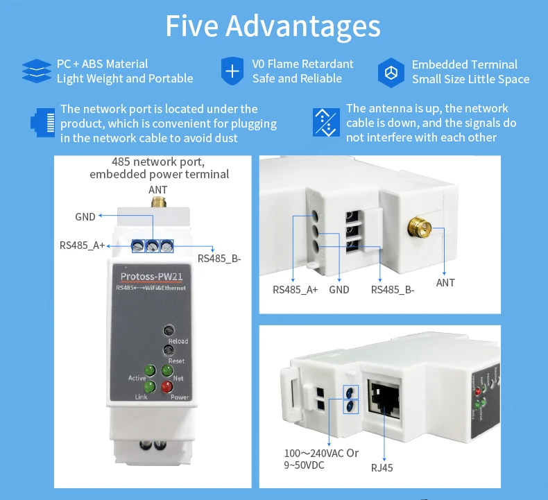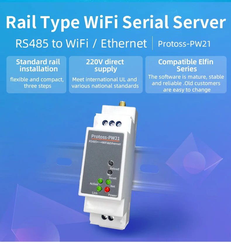 Protoss-PW21-M is RS485 toWi-Fi сервер, RJ45 Ethernet,Входная мощность от 9 в до 48 В постоянного тока;