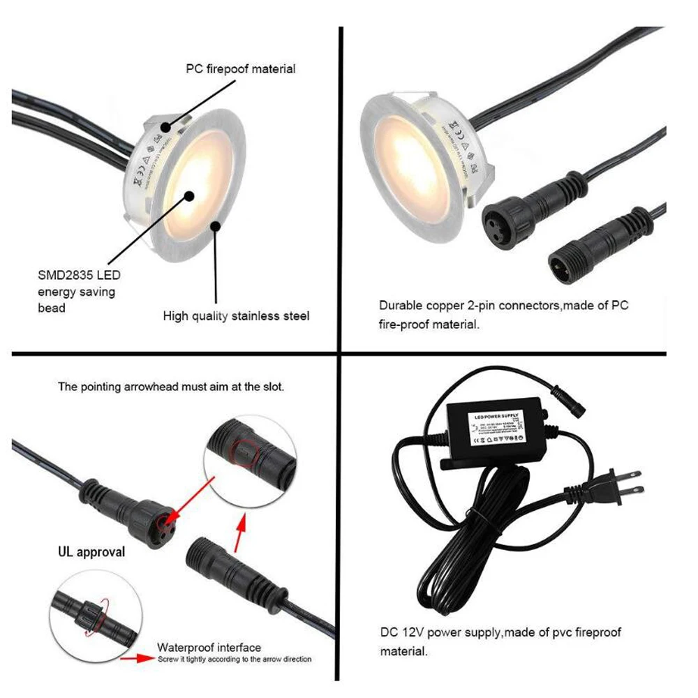 Трансформатор Вход: AC 85-265 в пер. тока, 50/60 ГцСветильник палубы Onput: 12VDCТип светодиодный: SMD2835Мощность: 1,5 Вт/шт.Световой поток: 50 лм/штИсточник питания: 15 ВтТип вилки: США, Великобритания, Австралия, ЕС (опционально)Сертификация: CE ROSH FCCУровень защиты: IP67 водонепроницаемыйМатериал: Поликарбонат и нержавеющая стальСрок службы: 35 000 часовЦветовая температура: 3000K (теплый белый) /4500K (натуральный белый)Размер одиночной лампы: 55 55*20*4040 ммРабочая температура: -50 ℃ - 50 ℃Светильник угол: 120 градусовГарантия: 2 годаРасстояние между светодиодами: около 100 смОдиночный светильник Длина кабеля: около 100 смОбщая длина от вилки до лампы: около 250 смДлина адаптера: около 150 смПосылка включает:Согласно вашей покупке