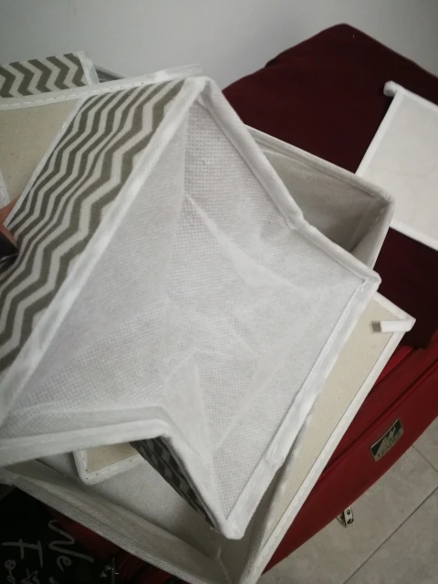 Размеры и цвет соответствуют фотографиям, что делает корзины правильными. Однако они построены в довольно мягком картоне, и когда они открываются, они также не могут «забыть» форму, в которой они были сложены (или с использованием утюга). С маленькими корзинами не так много проблем, и они умудряются держать форму лучше. Отделка ткани плохая, с некоторой свободной нитью на углах и внутри только обивка одной стороной (способствует низкой стойкости фона) И с плохой отделкой в remates.