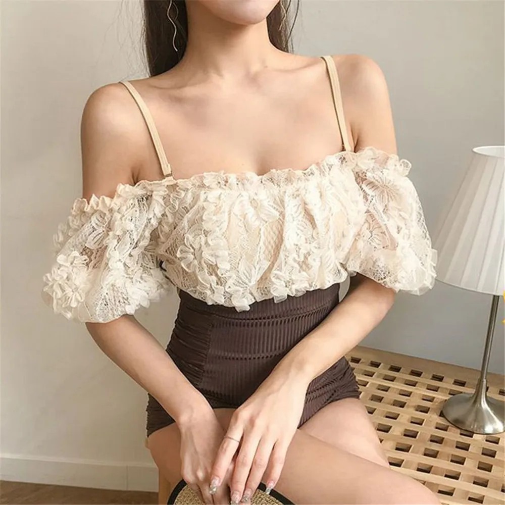 Сексуальный цельный купальный костюм с открытыми плечами, Женская однотонная одежда для плавания, кружевной Монокини, бархатный купальный костюм, подушечки, трикини, корейский купальный костюм, бежевый