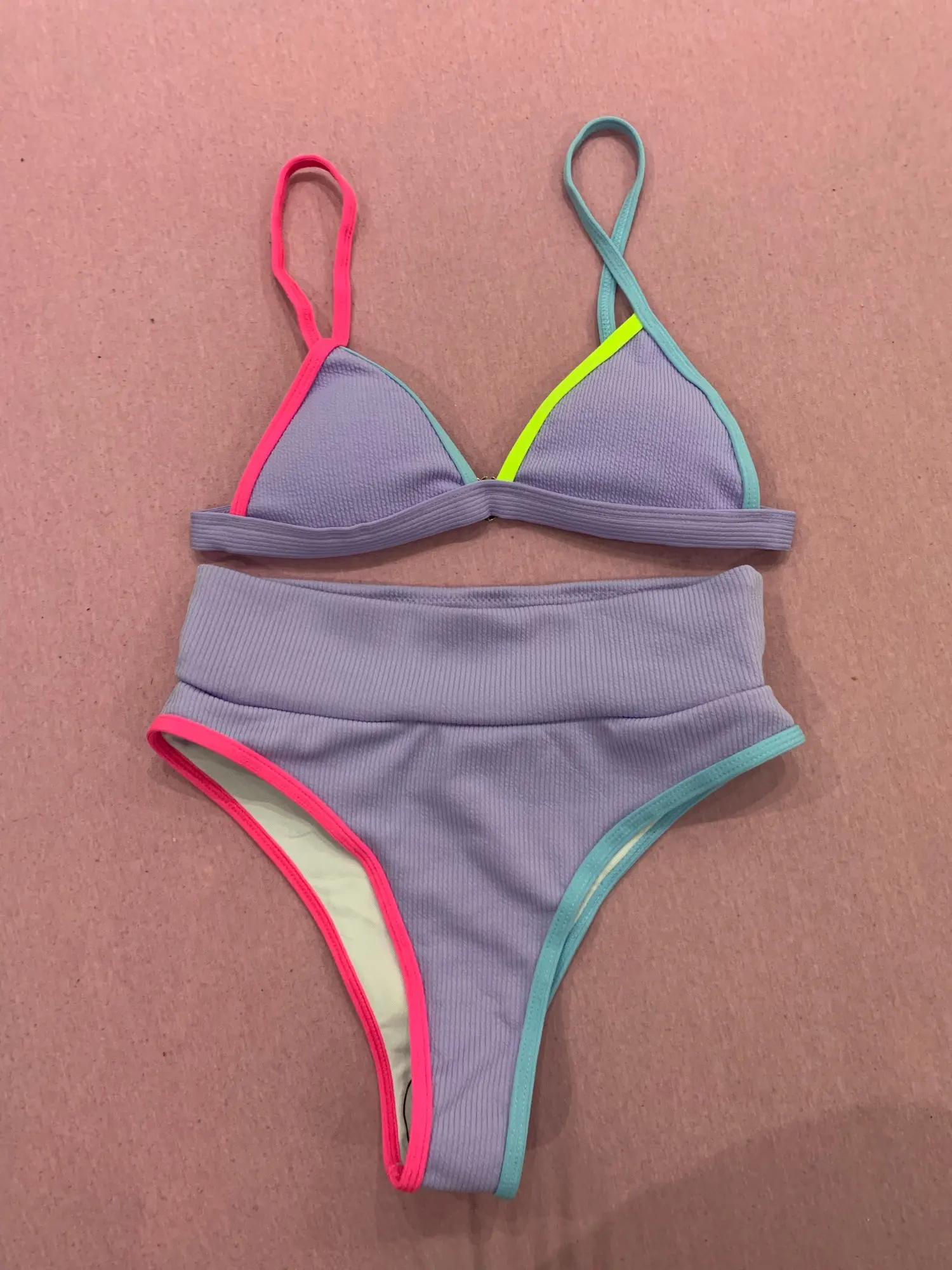 Купальник женский в рубчик, 4 цвета, с высокой талией, Раздельный комплект бикини, купальный костюм с принтом, V2443, женский купальник бикини