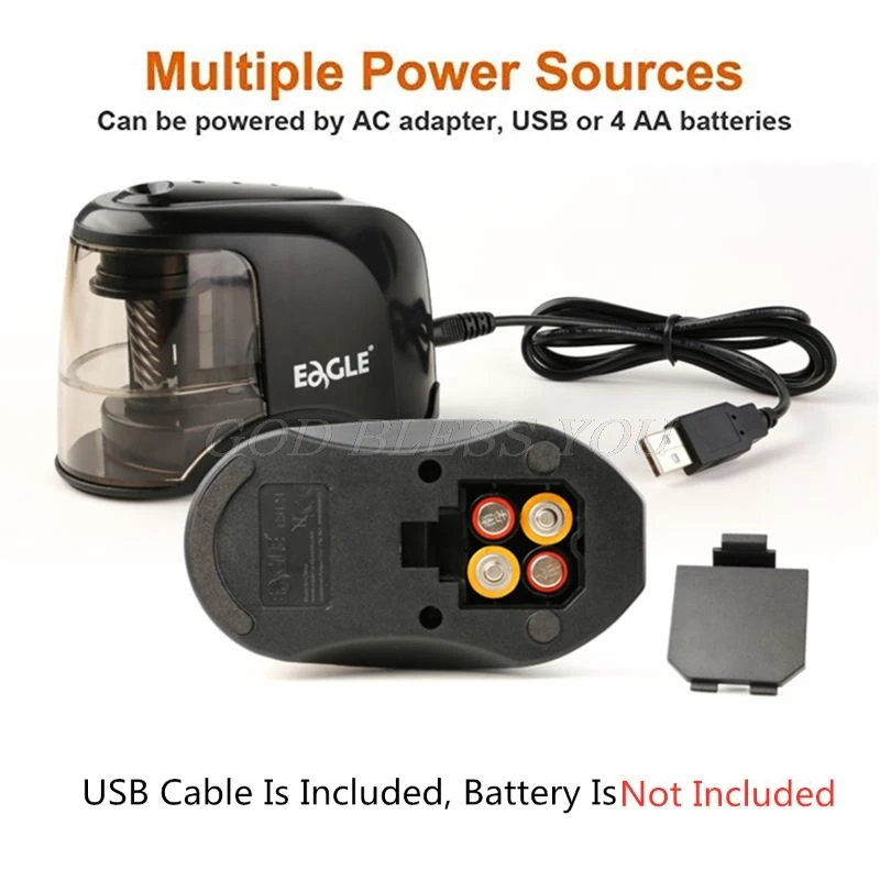 Точилка точит! Работает от 4 батареек АА (они придают ей весу и солидности) либо от USB через прилагающийся провод. Есть защита от работы без контейнера для стружки.