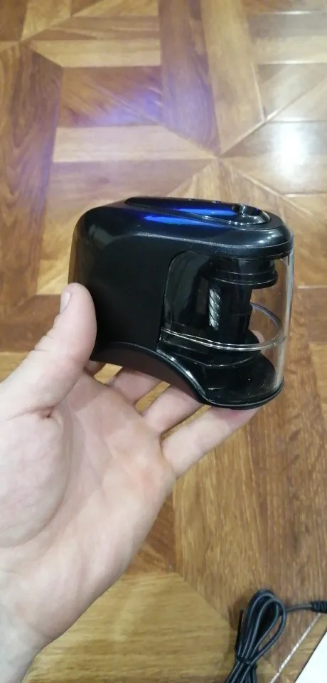 Точилка хорошая. Сенсор срабатывает как только вставляешь карандаш. Вставили 4 батарейки, работает. Посмотрим на сколько хватит заряда. Был в комитете шнур, единственный минус usb без адаптера, надо придумать, куда воткнуть. В целом хорошая. Рекомендую