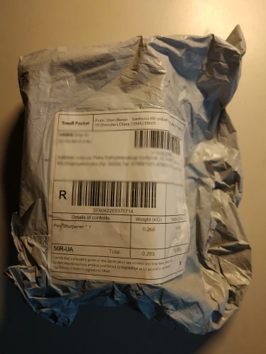 Точилка на вид выполнена качественно, в работе ещё не пробовал. Пришла за 20 дней, по сроку нормально. Коробка слегка помята, точилка не повреждена.