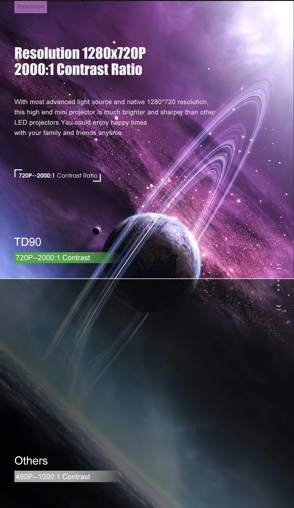 Изображение не так хорошо, как должно быть, даже делая все настройки фокуса, края изображения размыты, фокус больше на центре изображения, если проектор не находится под углом обзора 90 °, изображение будет более размыто. Сомнения, если действительно родное HD 1280x720p, даже приближение к максимально допустимой стене проектора, все еще может видеть большие пиксели.