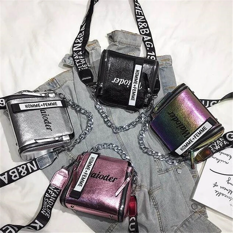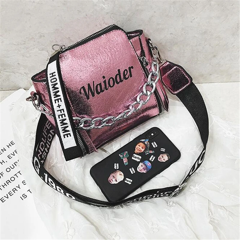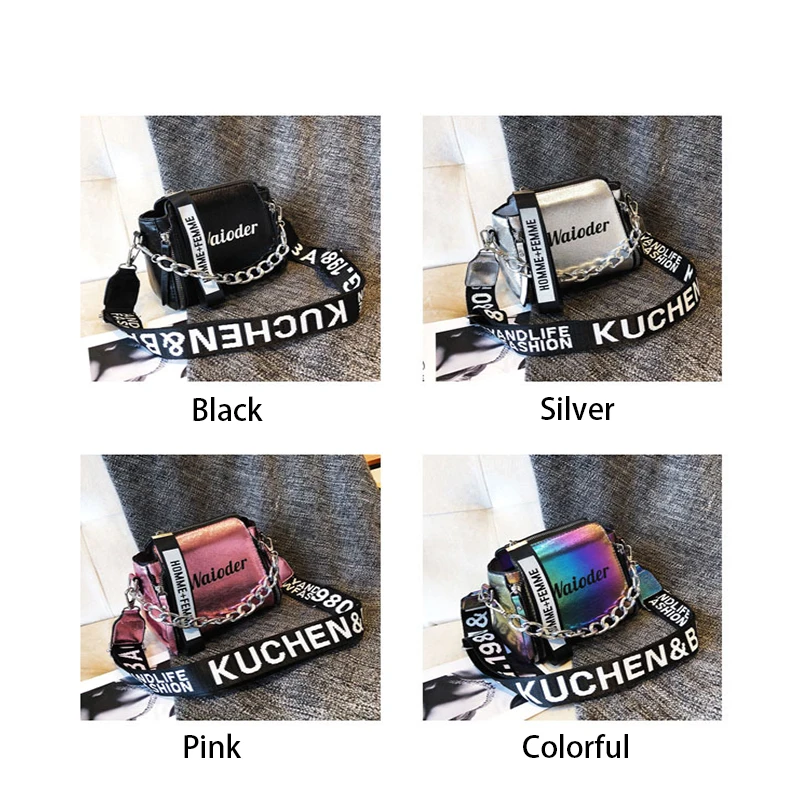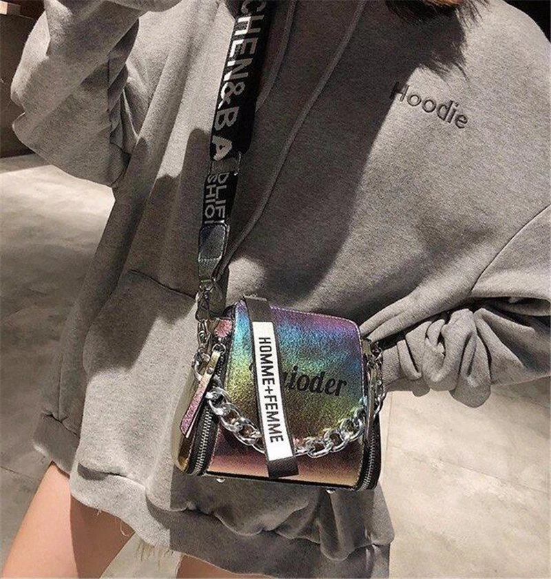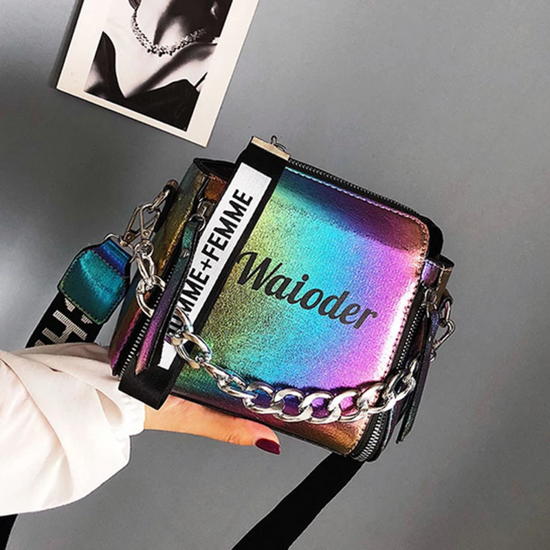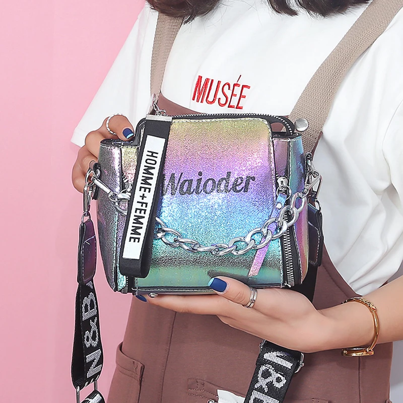 Яркая лазерная сумка на плечо для женщин, Сумочка через плечо с надписью и широким ремешком, модная дамская сумочка-мешок из искусственной кожи на молнии с цепочками