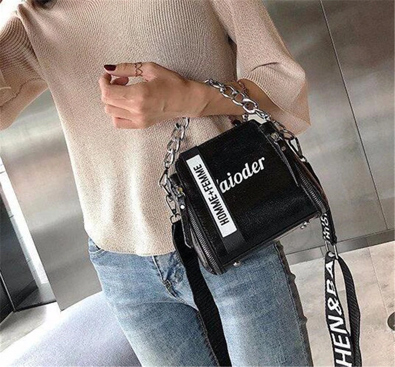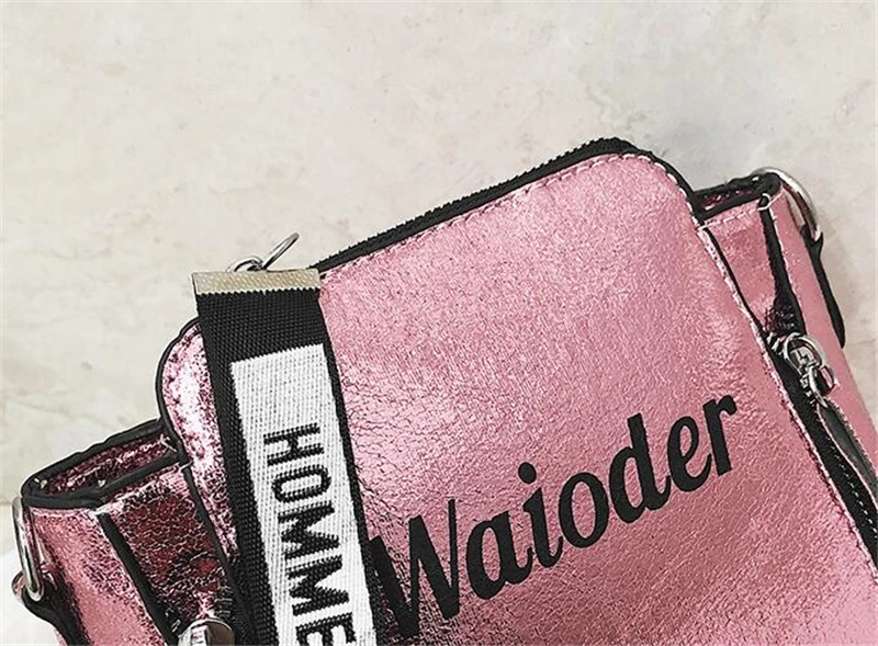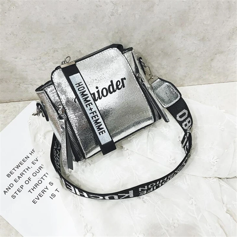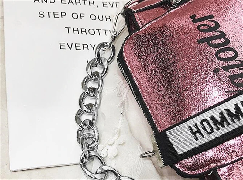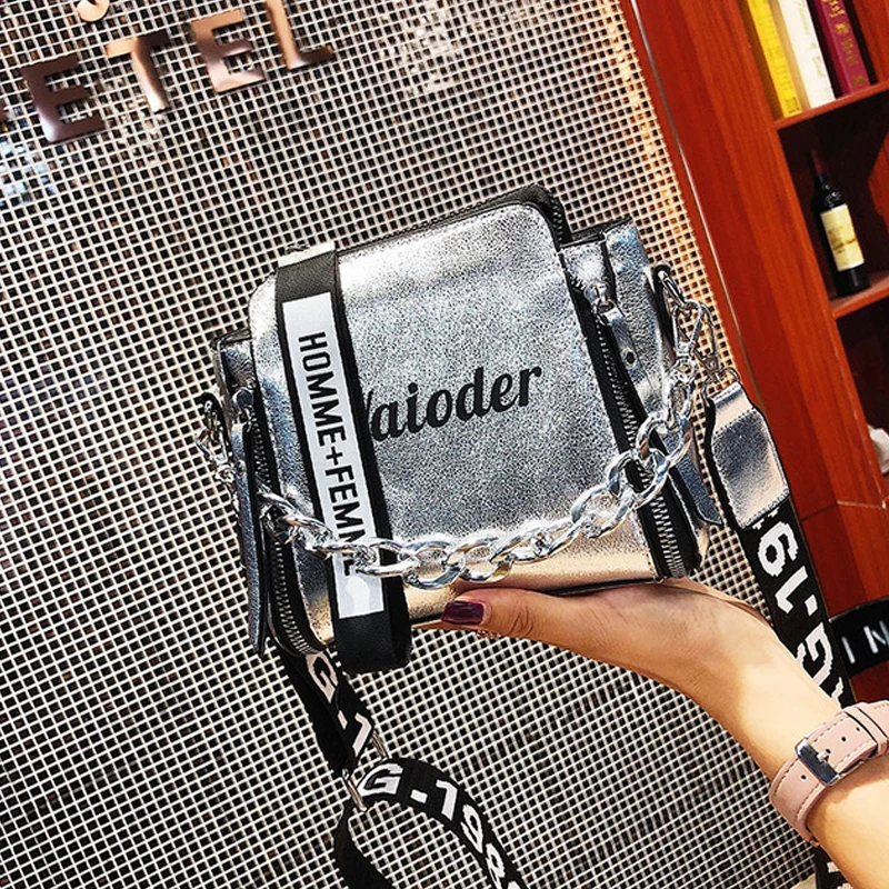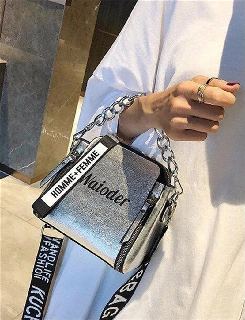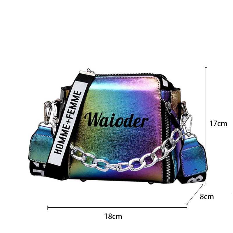 Яркая лазерная сумка на плечо для женщин, Сумочка через плечо с надписью и широким ремешком, модная дамская сумочка-мешок из искусственной кожи на молнии с цепочками