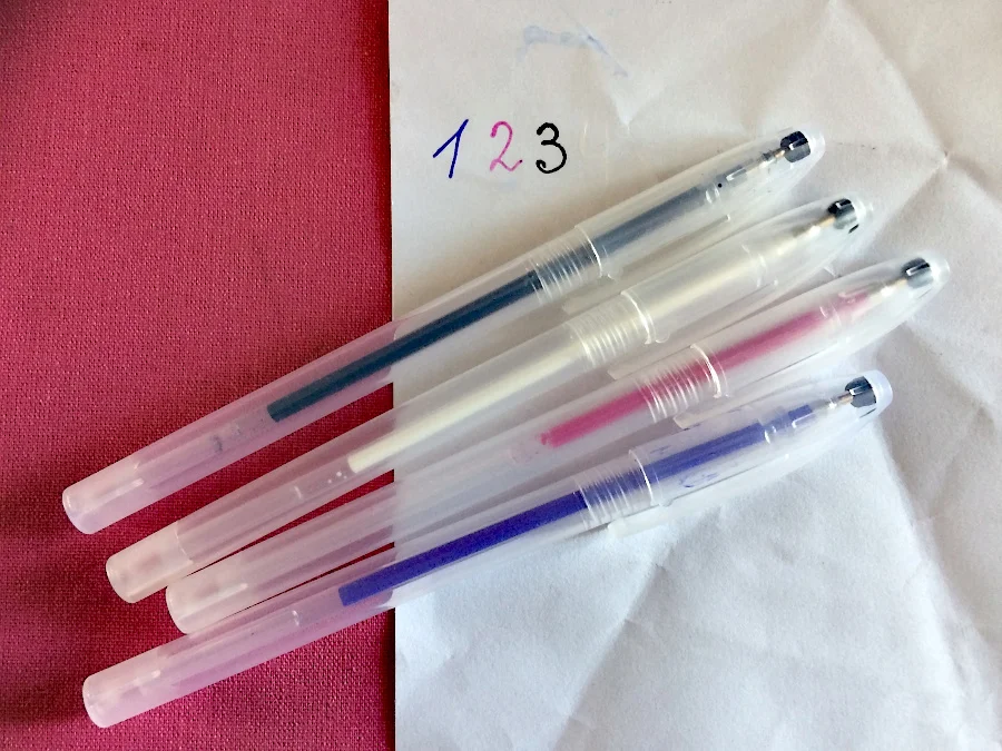 Очень классные, легко рисуют по ткани (очень выручают при работе с шелком, вискозой и другими скользкими тканями). Не оставляют следов после утюга. Белый цвет проявляется не сразу и с тёмными, глянцевыми тканями не особо хорошо работает. Будьте готовы к тому, что у них очень большой расход, поэтому советую запастись запасными стержнями.