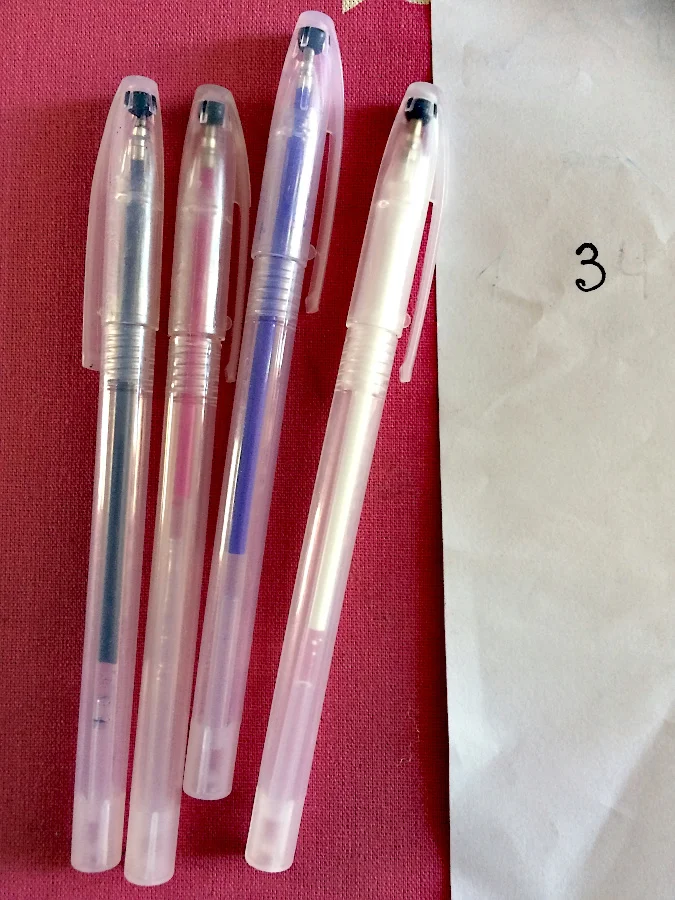 Белые, фиолетовые и розовые стираются теплом. Черного цвета нет. Он был частично удален водой, поэтому я ожидаю, что он выпустится при стирке. Я ожидал, что все они будут удалены теплом, как описано. Фотография с бумагой, результаты лучше с тканью для трех рабочих цветов (не видно никаких следов цвета).