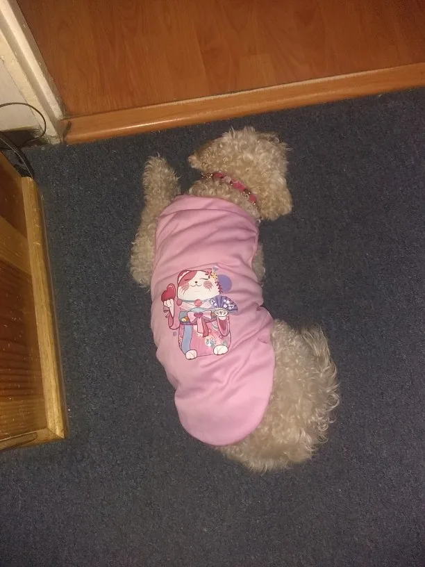 The size is way bigger than they say it is on their chart. Dog summer T-shirt drowned her in it. But it is cute