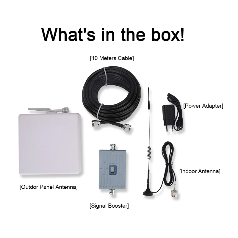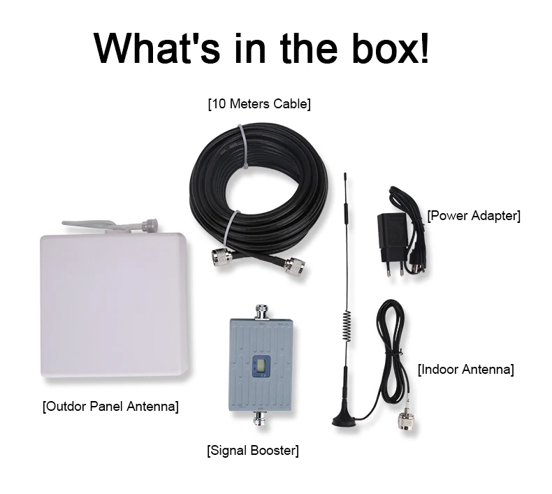 1. Ретранслятор сигнала 4G LTE 2600 МГц2. Наружная антенна с усилением 10 дБи3. Внутренняя антенна с усилением 3 дБи4.3D 13 м кабель5. Адаптер питания