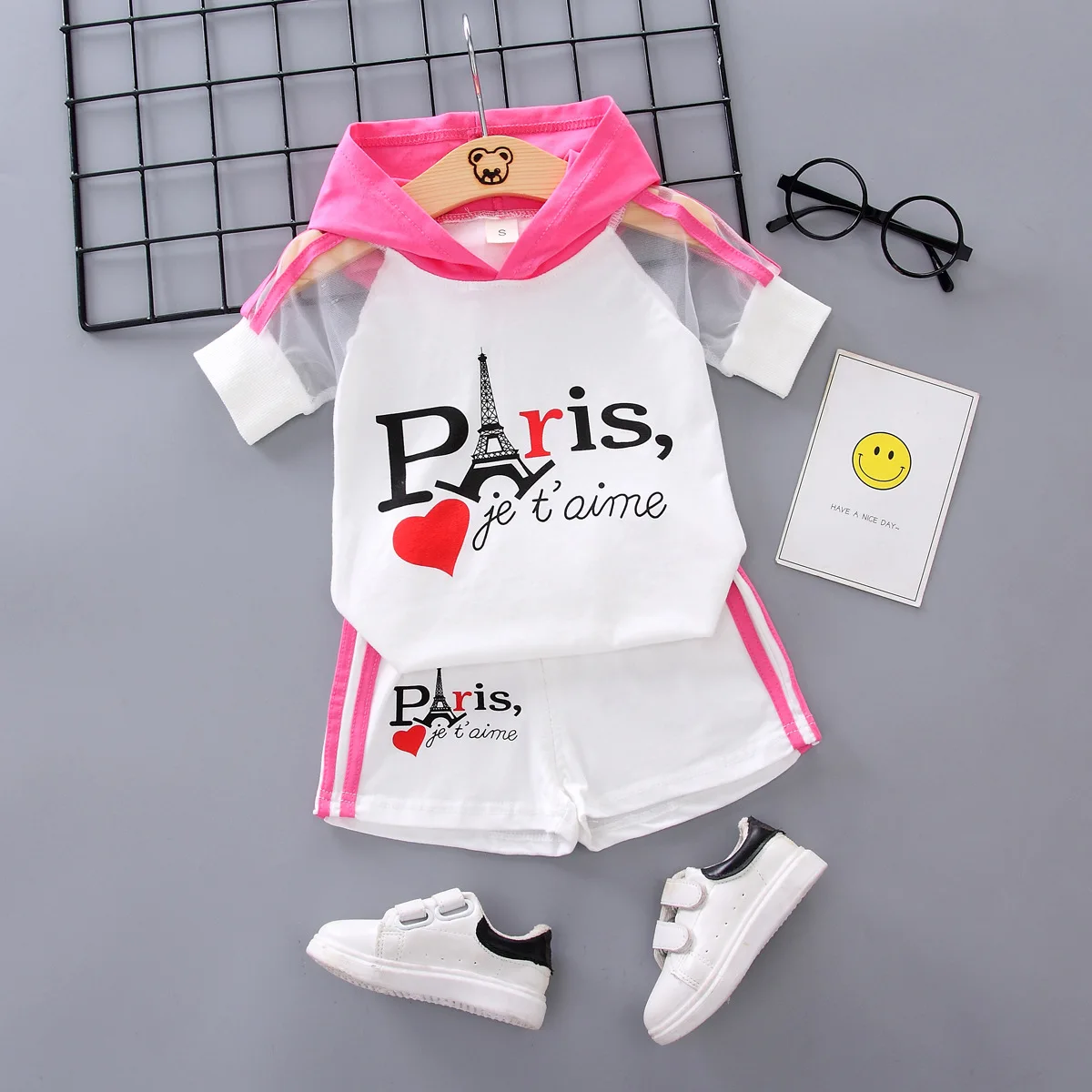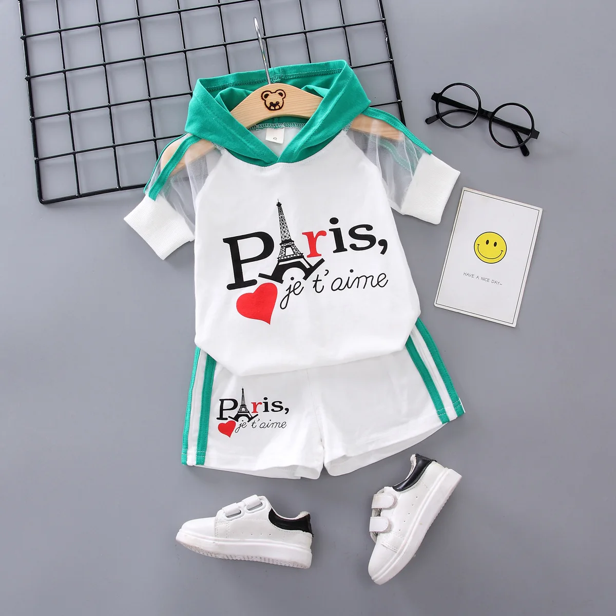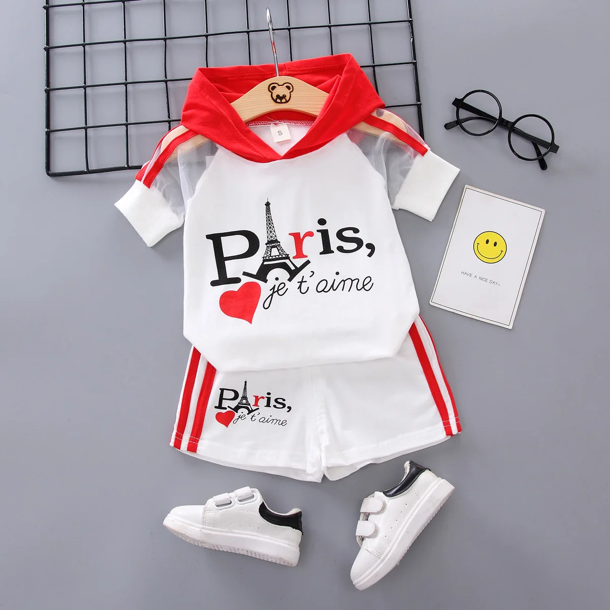 Летний костюм с футболкой с капюшоном топы с короткими рукавами и шорты комплекты для малышей с принтом из мультфильма комплекты детской одежды для маленьких мальчиков и девочек