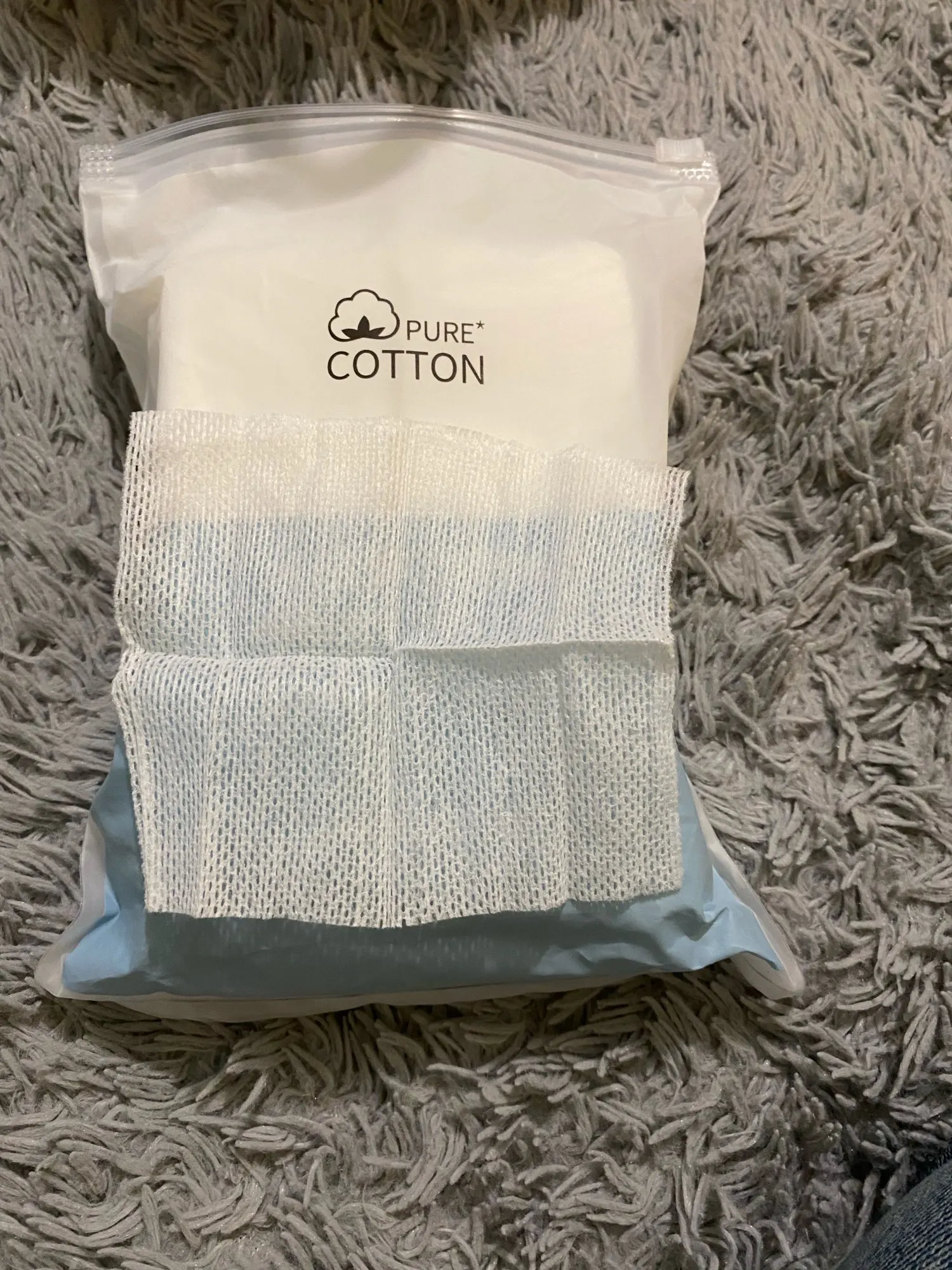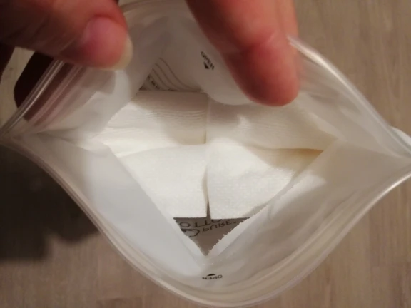 как на фото. очень хорошие марлевые кусочки для снятия макияжа. я осталась довольной .