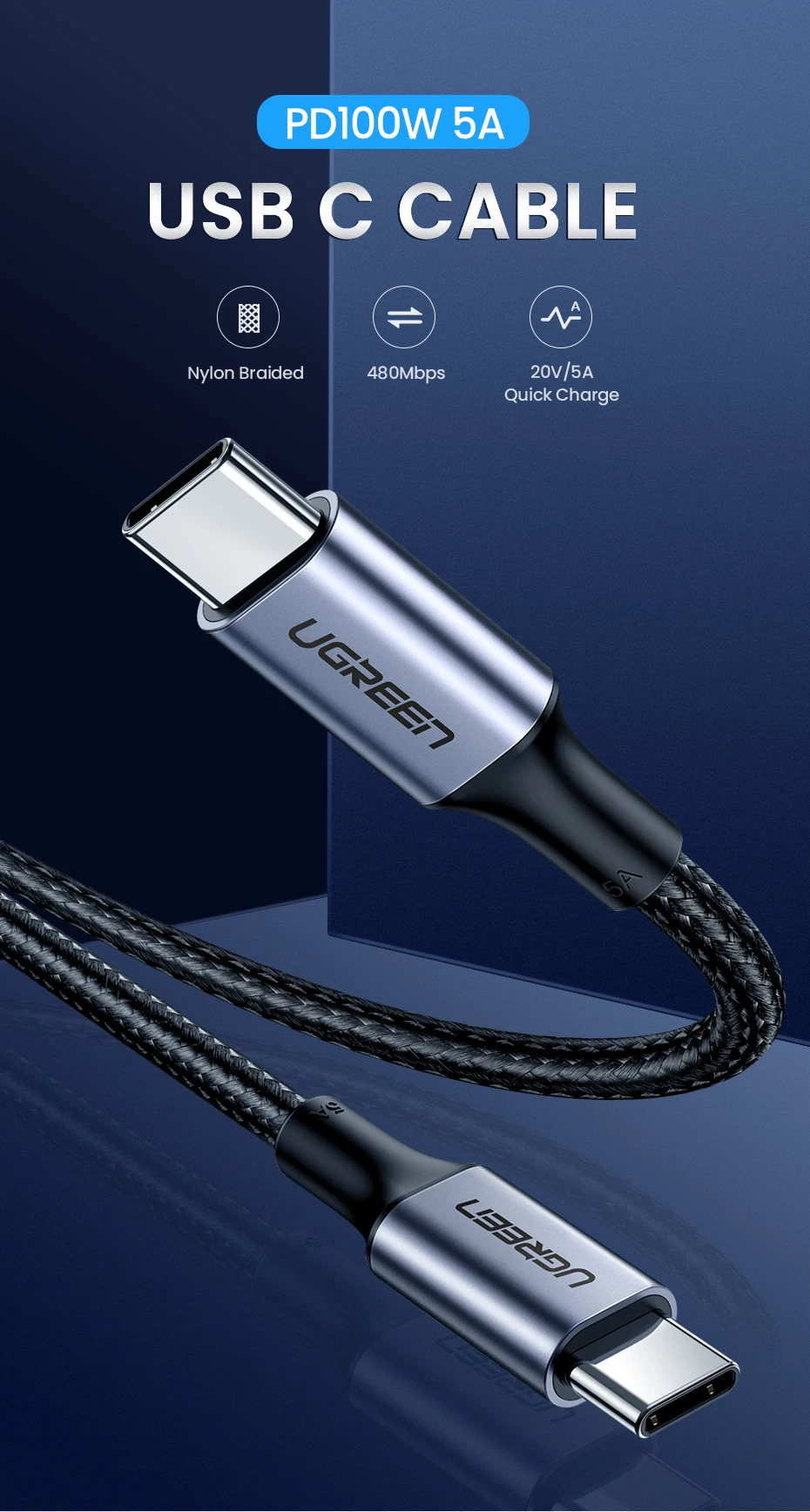 UGREEN USB C к USB C кабель PD100W USB Type C зарядный кабель для MacBook Pro iPad Pro 2020 Samsung S20 S10 быстрое зарядное устройство USB