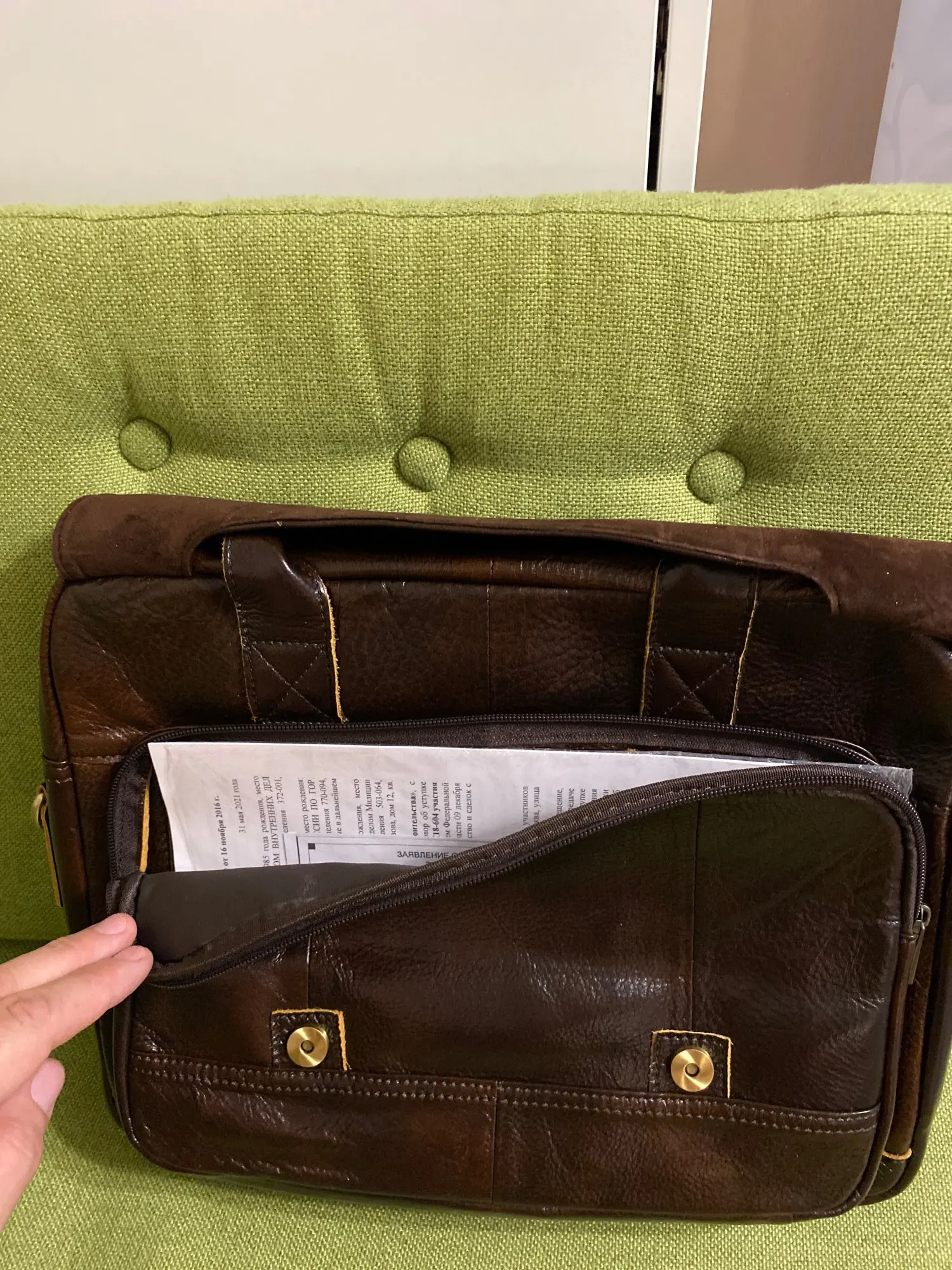 Сумка соответствует описанию. Очень похоже на настоящую кожу, может не самую дорогую, но кожу. Ноут входит. Передний карман под формат А4. Была выбрана быстрая доставка, 28.09, а 01.10 уже была у меня.(Москва).