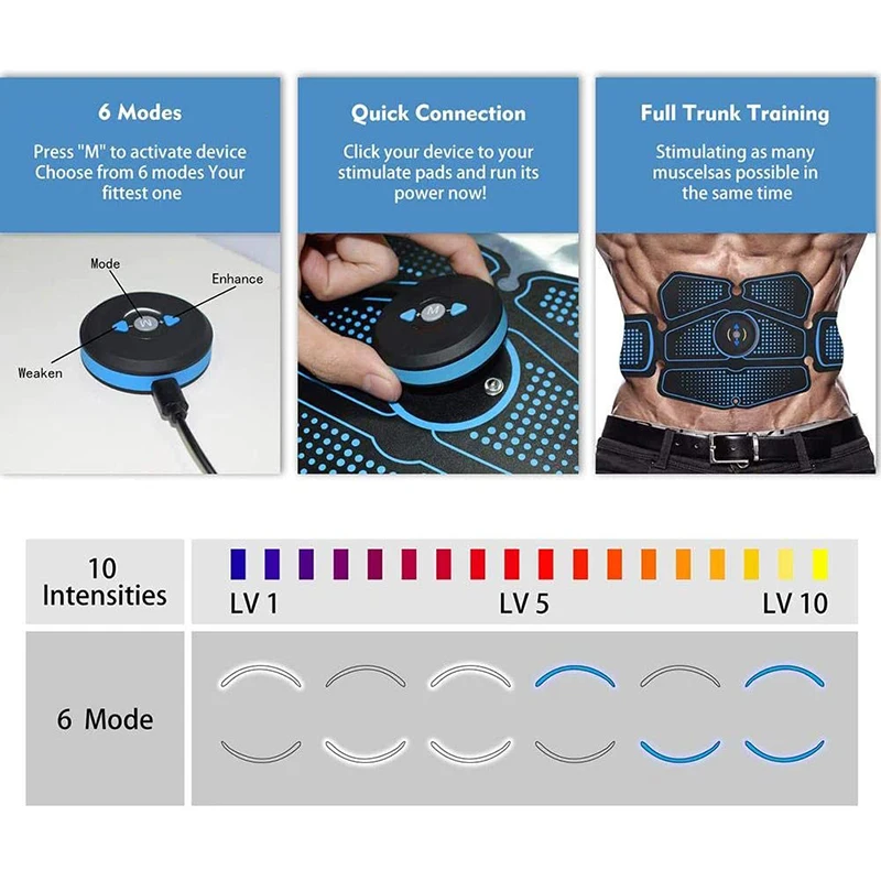 Особенность 1: электрическая стимуляция мышц позволяет регулировать и укреплять мышцы, направлять импульсы напрямую в мышцы, стимулировать движение мышц, сжигать жир и устранять усталость и стресс, вы сможете улучшить фигуру тела после последовательного использования стимуляции мышц примерно в течение нескольких часов. 2 месяца. Особенность 2: мышечный Стимулятор EMS имеет 6 программ тренировки и 10 уровней интенсивности, вы можете установить различные программы и уровни в соответствии с вашими потребностями для достижения желаемого эффекта тренировки. Особенность 3: простота использования: суперсветильник, ультратонкий, пригодный для носки и удобный для переноски. Эргономичный дизайн, ориентированный на упражнения для мышц живота. Зафиксируйте фитнес-снаряжение в том месте, где вы хотите укрепить мышцы. Для включения питания нажмите кнопку «+» в течение 3 секунд; Для выключения питания нажмите кнопку «-» в течение 3 секунд. Фитнес в любом месте и в любое время. Особенность 4: встроенный аккумулятор, вы можете заряжать электронный модуль в любое время через USB-порт для зарядки. Этот тренажер для живота ульсветильник, ультратонкий, износостойкий и удобный в носке, его можно носить незаметно под одеждой. Особенность 5: используется зарядка через USB, а интенсивность упражнений устройства увеличивается на 50% по сравнению с аналогичными продуктами. Особенность 6: использование 20 минут эквивалентно 20 минутам тренировки мышц, плаванию около 2000 метров, занятию 60 минут, 60 минут или 2 недели диеты.