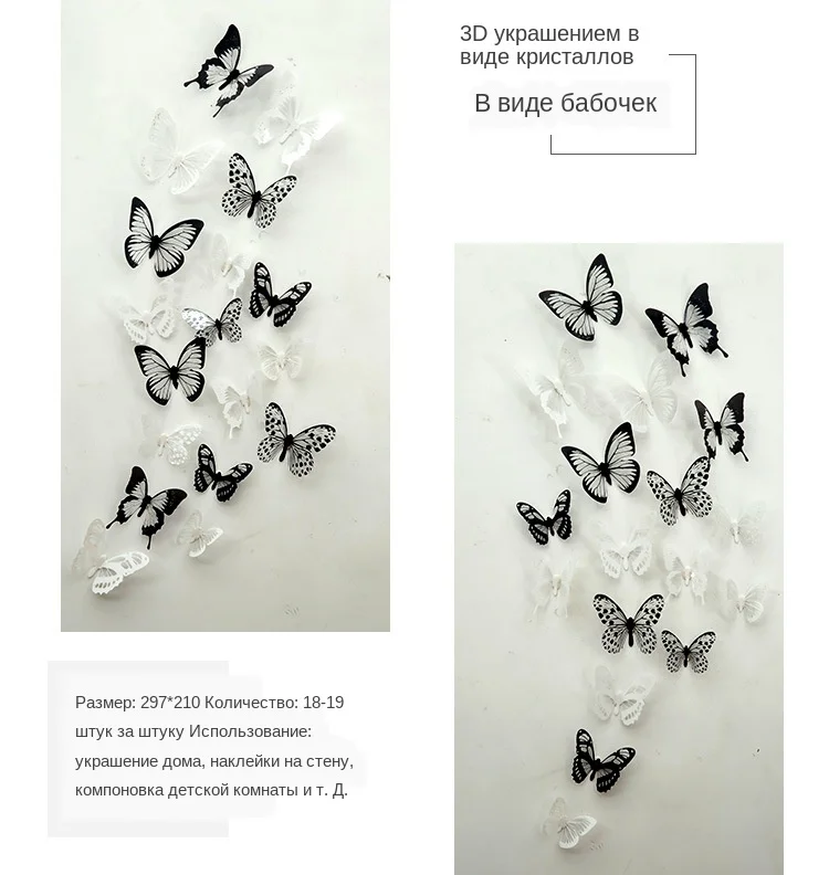 18 шт. черно-белых кристаллов с 3d-эффектом стикер на стену с бабоч...