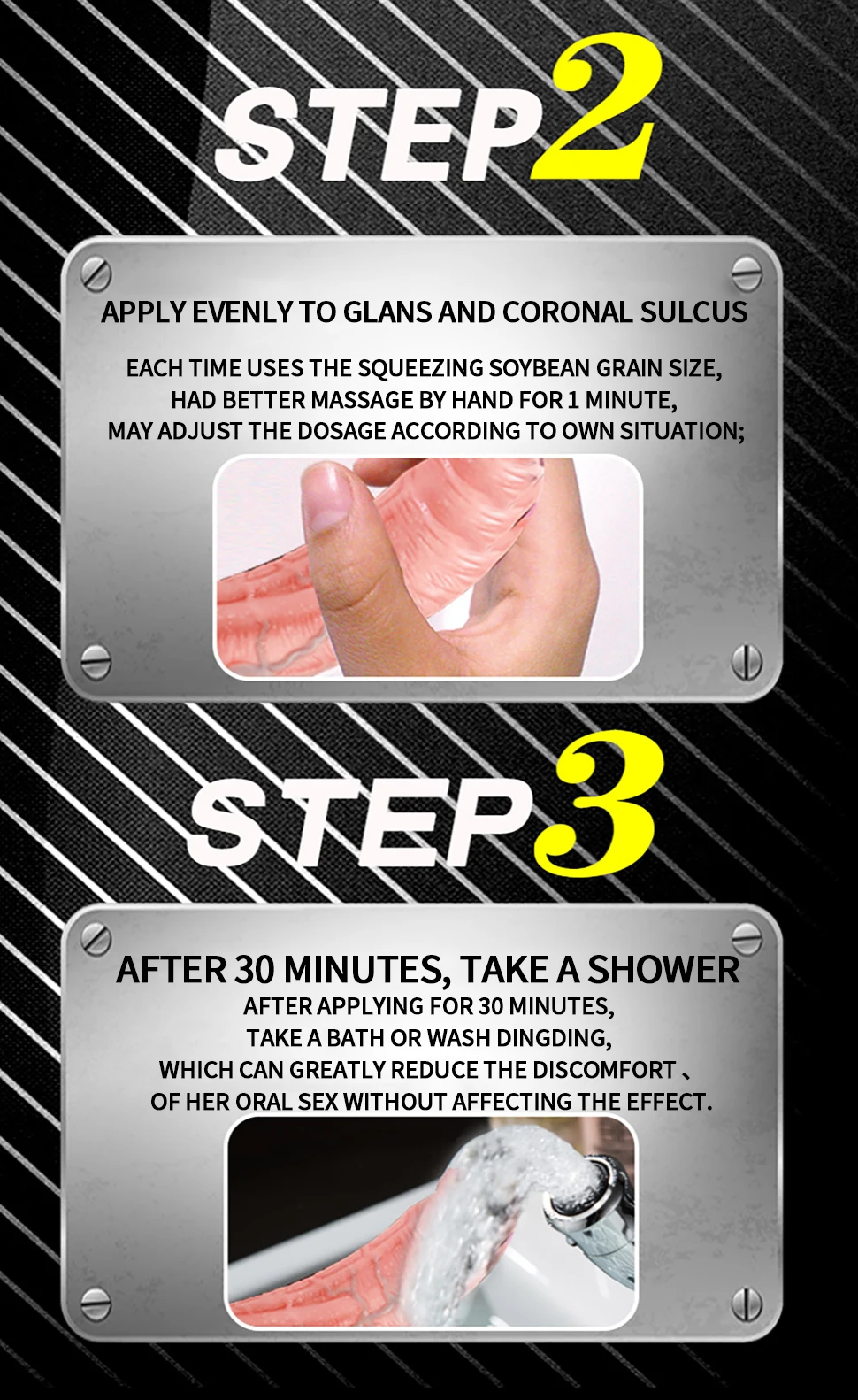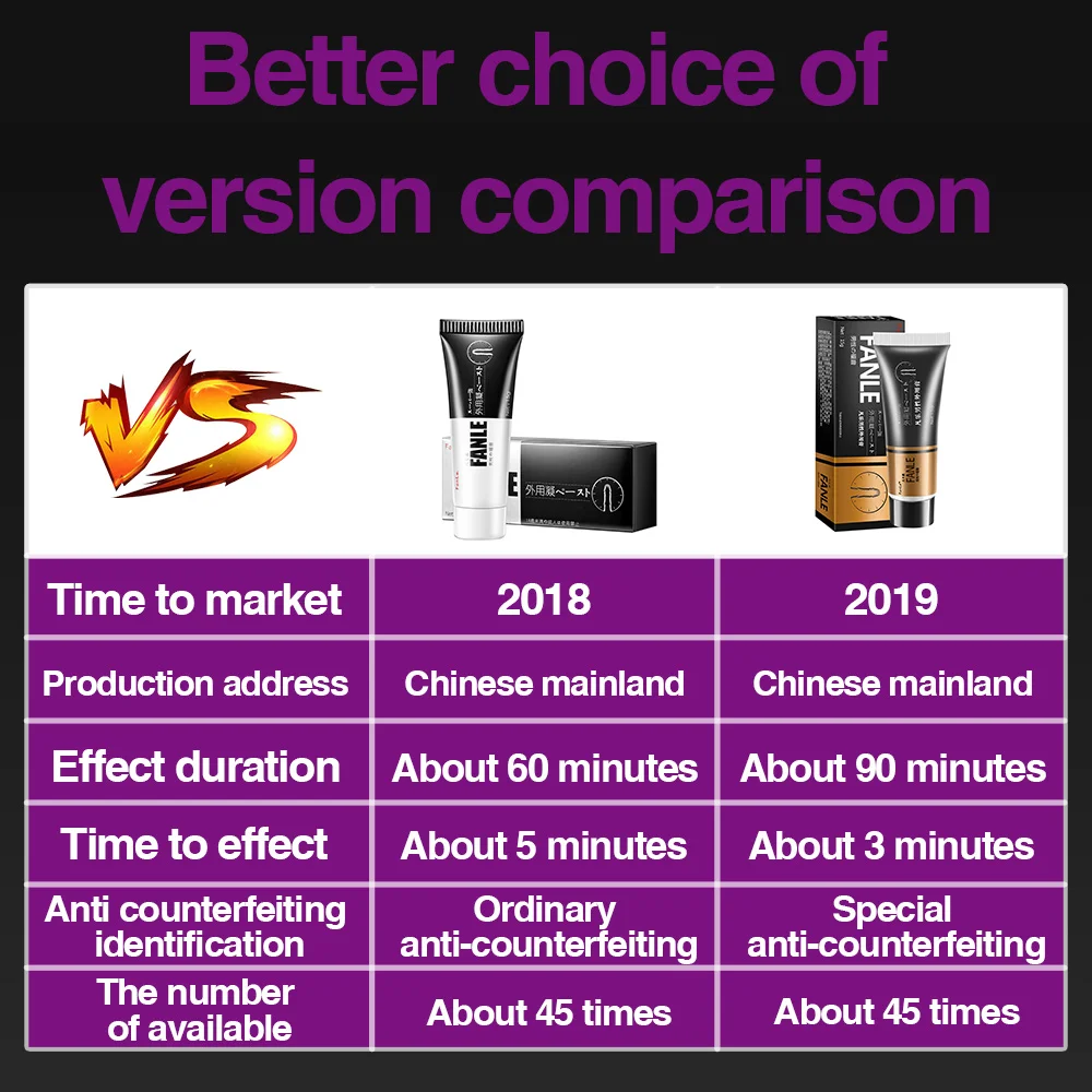 Существует две версии пасты с временной задержкой, черная и белая это первое поколение, которое имеет эффект примерно через пять минут после нанесения, и является водонепроницаемым, которые могут продлить время на 60 минут; Черный и золотой-второе поколение, Которое изменяется первым поколением, которое может продлить время на 90 минут, а черное и Золотое эффективно и водостойко после нанесения в течение 3 минут