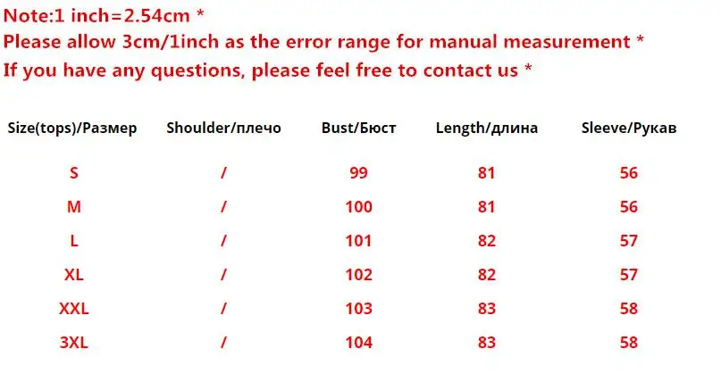 Размер (Топы)/Размер Плечо/плечо Бюст/Бюст Длина/ширина Рукав/Рукав S / 99 81 56 М / 100 81 56 L / 101 82 57 XL / 102 82 57 XXL / 103 83 58 3XL / 104 83 58