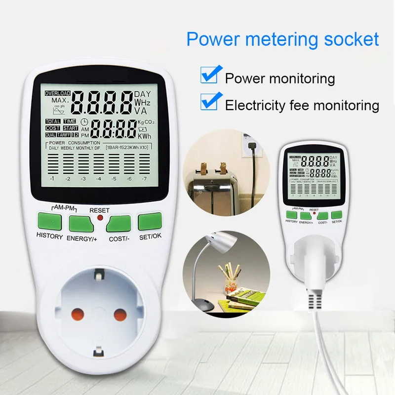 Особенности:-- Многофункциональность: Подключите этот счетчик электроэнергии к приборам, чтобы увидеть их истинную эффективность. Этот измеритель помогает измерять напряжение, мощность, энергопотребление, силу тока, функцию времени и многое другое. Он также может рассчитать электрический заряд.-- Ясно для чтения: этот товар оснащен большим ЖК-экраном с четким цифровым дисплеем, что позволяет легко просматривать использование электроэнергии в реальном времени и показания стоимости.-- Простота в использовании: вы просто подключите это устройство к стене электрической розетки.-- Функция: он может вычислить затраты на электроэнергию, помогая сэкономить ваши деньги.-- Премиум качество: Он изготовлен из высококачественного АБС-материала, который устойчив к раме, термостойкий и прочный для длительного использования.