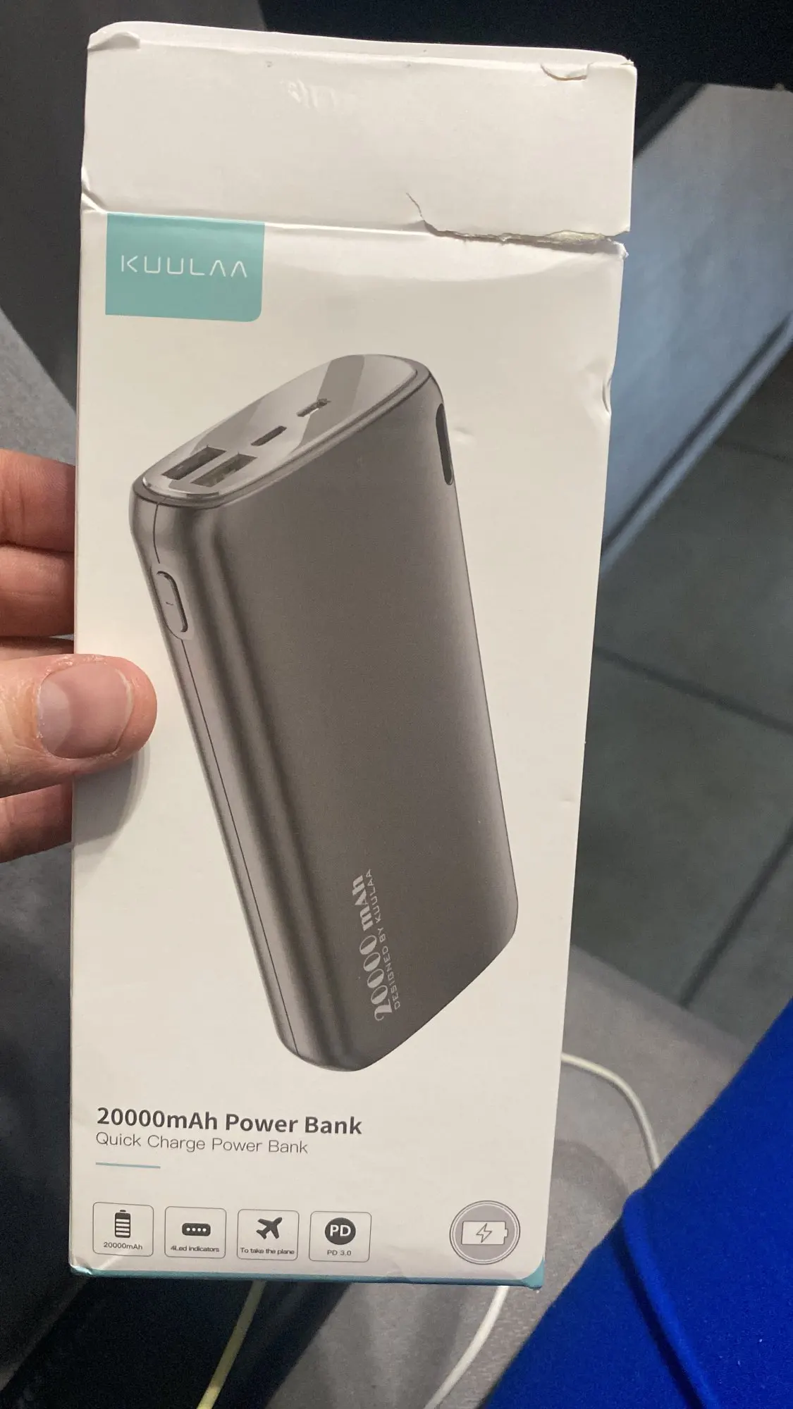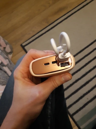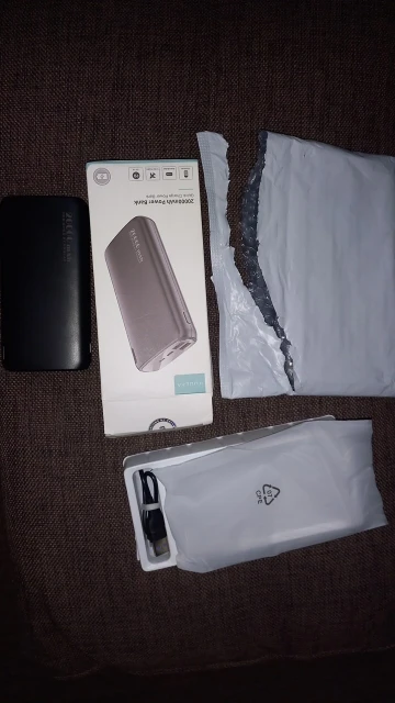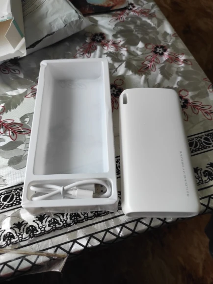 Попросила продавца отправить так чтобы коробка не помялась, т.к. это идет на подарок. Упаковка так себе и коробочка немного помята. Но все целое что уже радует. Повербанк заряжен полностью, можно пользоваться сразу. Внутри проводок на Micro USB