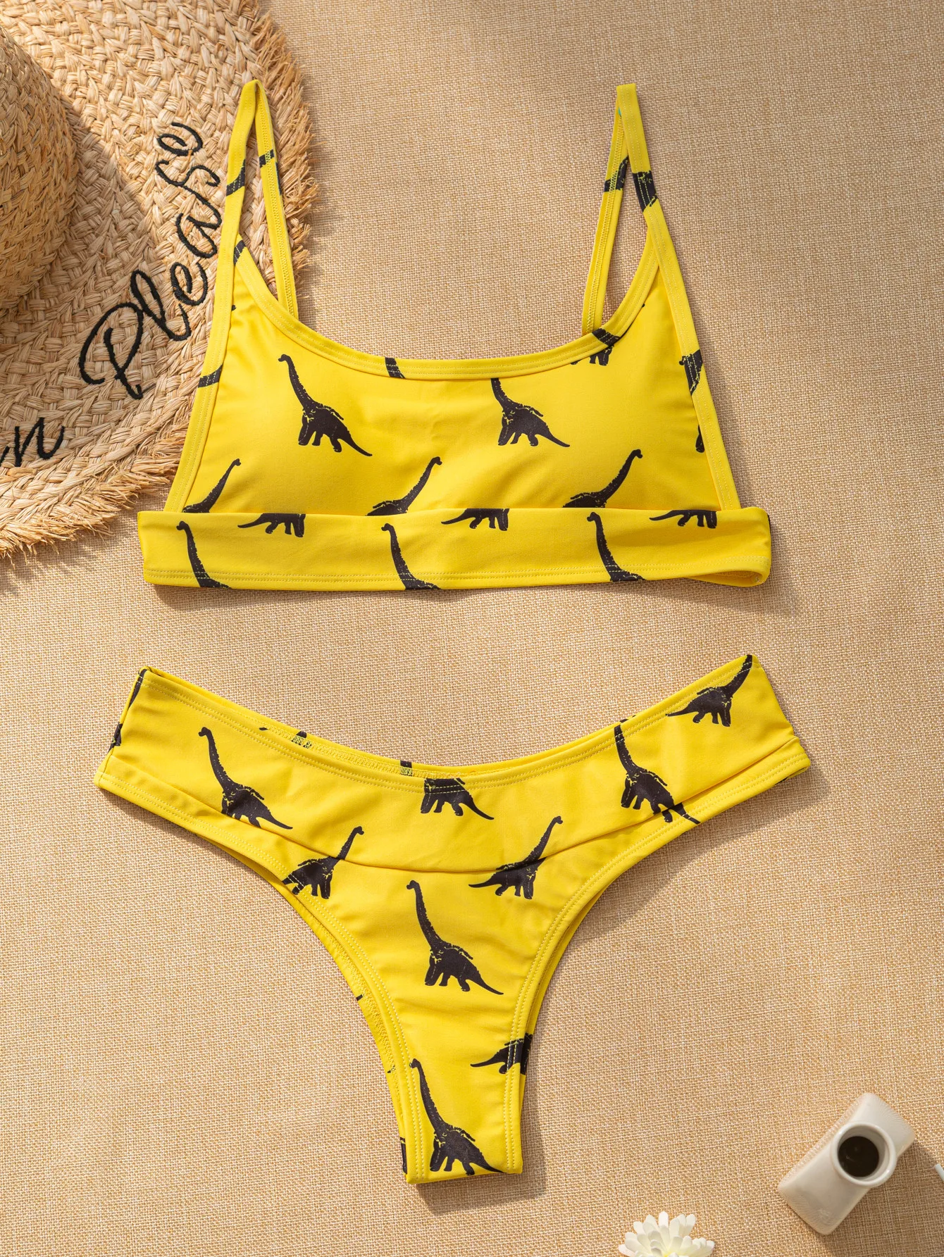 Купальник женский однотонный с принтом жёлтого дракона, комплект из двух предметов, бикини с вырезами, купальный костюм, стринги, пляжная одежда