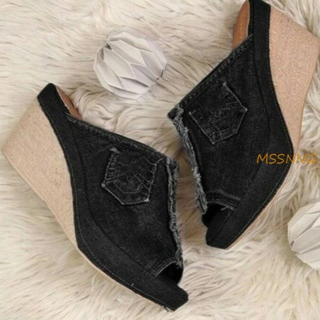 Шлепанцы женские из денима, танкетка на высоком каблуке, танкетка, ...
