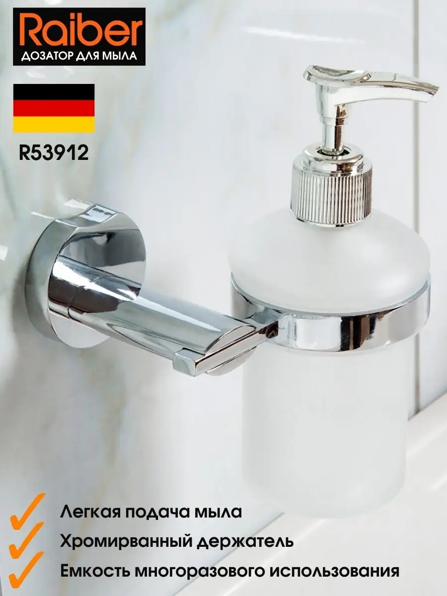 БрендRaiberКоллекцияR53912, хромАртикулR53912Страна-брендаГерманияКомплектПолныйНазначенияДля жидкого мылаКомплектациянастенный дозатор для мыла керамический (1шт), держатель для дозатора, монтажный набор.МатериалЛатунь, стеклоШтрихКод4634444102660Гарантия1 летВес кг0.55Размер упаковки Д/Ш/В20/11/23УпаковкаФирменная коробка, пакет, гарантийный талон