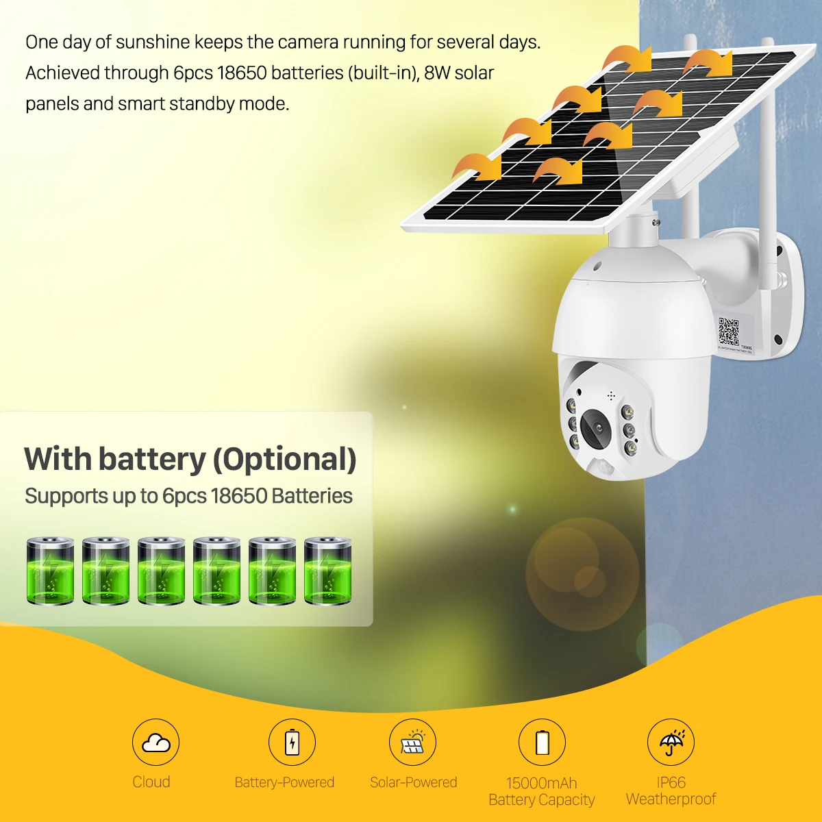 Батареи с солнечной батареей Одних суток после солнце удерживает камеру для бега в течение нескольких дней. Благодаря 6 шт. 18650 батареи (встроенный), 8 Вт солнечных панелей и умный режим ожидания -На солнечных батареях Wifi PTZ камера -- 2,0 мегапикселя, 90 ° Широкий угол обзора -Поддержка пассивный инфракрасный детектор движения, сигнал тревоги к мобильному телефону -Поддержка мобильных телефонных звонках и сообщениях обнаружения пассивного ИК-wake up -Поддержка карт памяти Micro SD до 1284GB, облачное хранение данных (первый месяц бесплатно) -- 100% без «косточек, металл + пластик материал корпуса -- IP66 из водонепроницаемого материала для использования на открытом воздухе -- PIR сигнализации, обнаружения движения -- Возможностью погружения на глубину до 30 м Цвет ночного видения/ИК ночного видения -Аудио вход: Встроенный микрофон -- Аудиовыход: со встроенным динамиком -8 Вт солнечная панель для зарядки в то же время электризуется для камеры -Рабочая температура: от-30 до 60 градусов