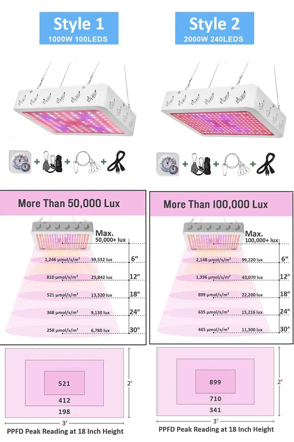Package of 100Leds or 240Leds1*grow light+1*adjustbale rope+1*thermometer+1*hanging set+plug