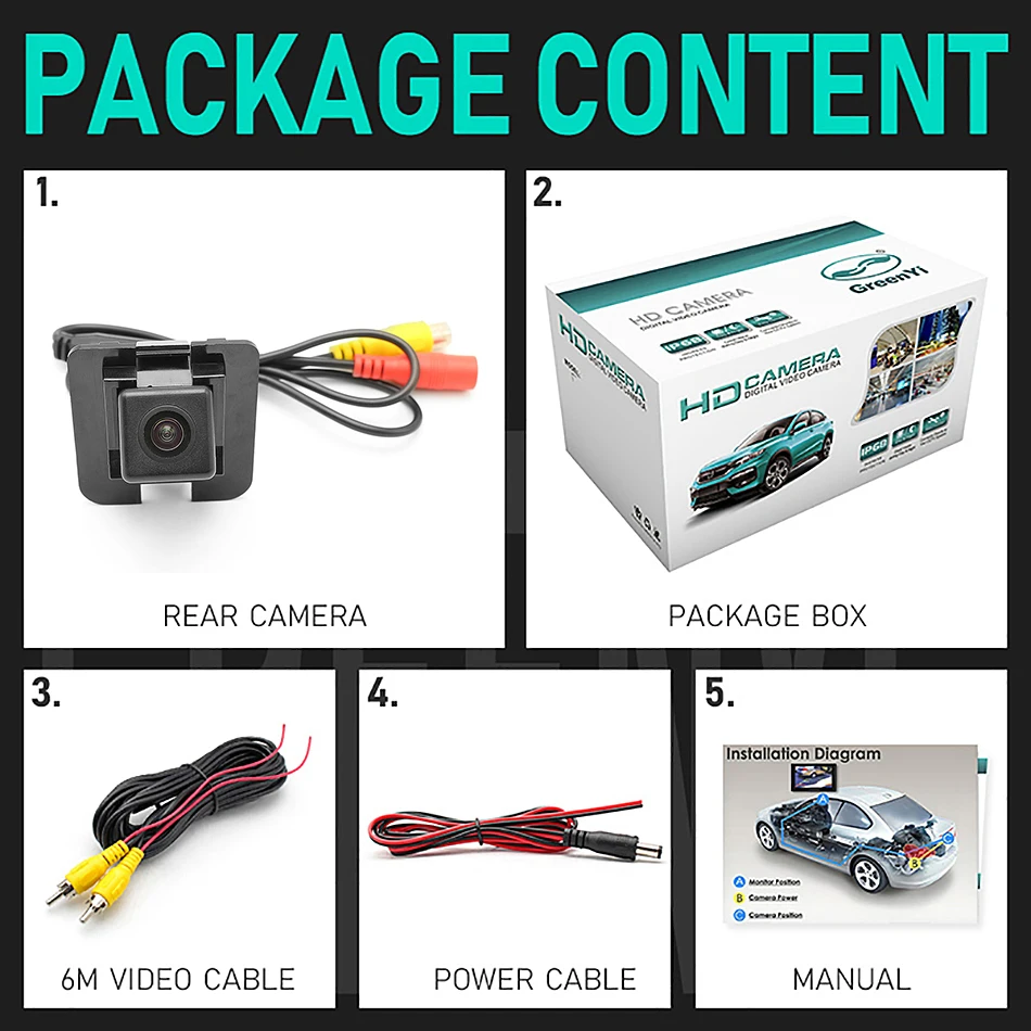 1. Камера заднего вида2. Саморез и коробка3. Видеокабель 6 м4. Кабель питания5. Руководство пользователя