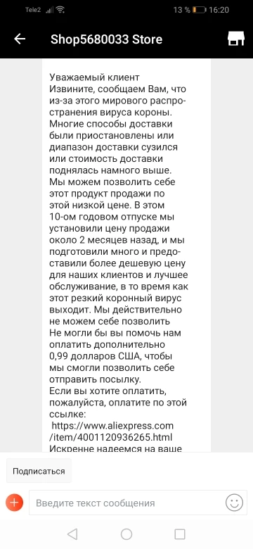 товар так и не пришëл. По окончании сроков, открыл спор, продавец попросил дать ему возможность исправить положение дела, я спор отменил, прошло ещë 3 недели. результат 0.