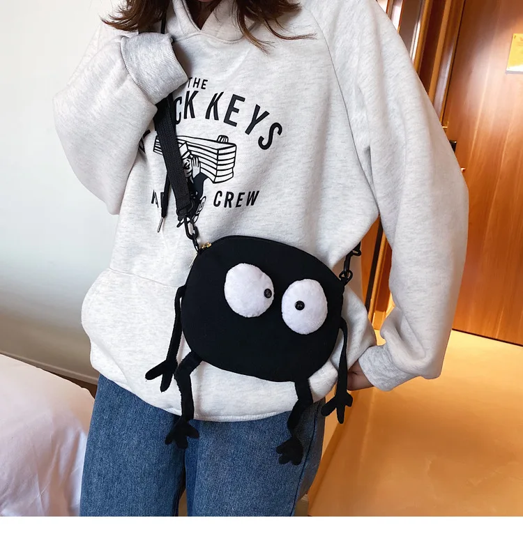 Глаза приклеены, "зрачки" тоже приклеены. Есть риск, что быстро отвалятся. Материал прям максимально дешевый, кое-где торчат нитки. Из плюсов: хорошо прошита молния и сама сумка, швы ровные. За 300 рублей можно брать, дороже эта сумочка не стоит.