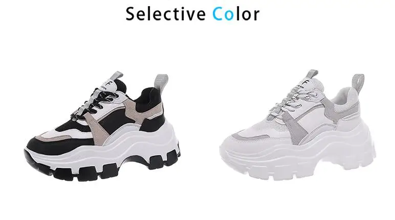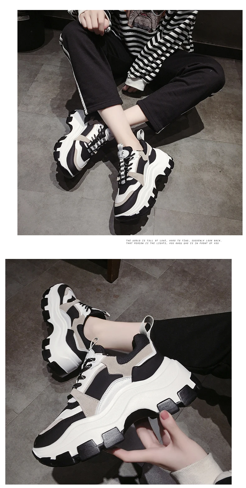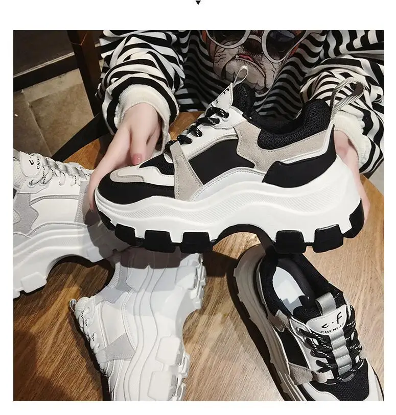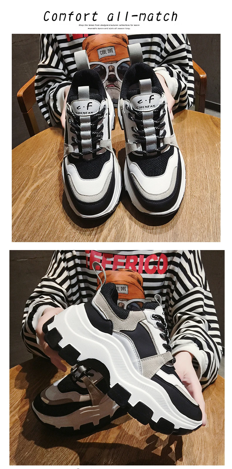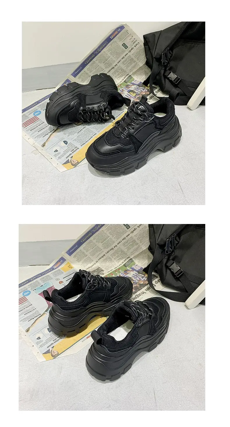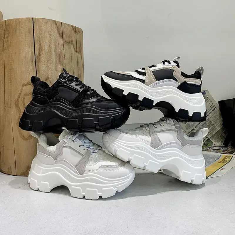 Кроссовки женские массивные, Корейская повседневная обувь для бега на платформе, Вулканизированная толстая подошва, модные, черные, белые, осень