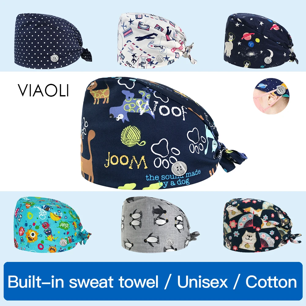 Viaoli Новые мужские и женские впитывающие пот Мультяшные печатные регулируемые скрабы Кепка на пуговицах шапки рабочие шапки Скраб Кепка оптовые цены