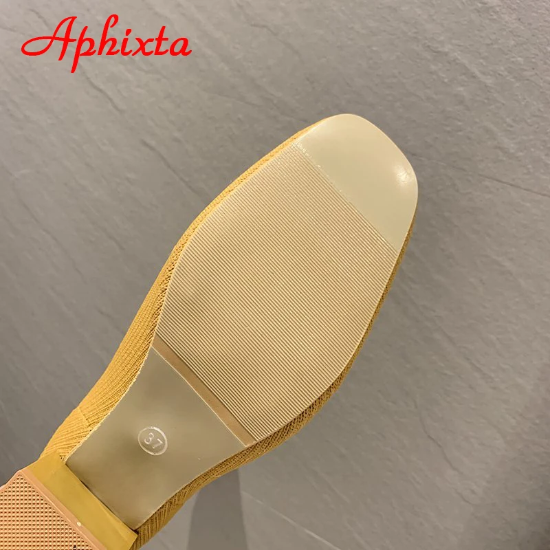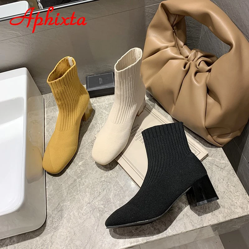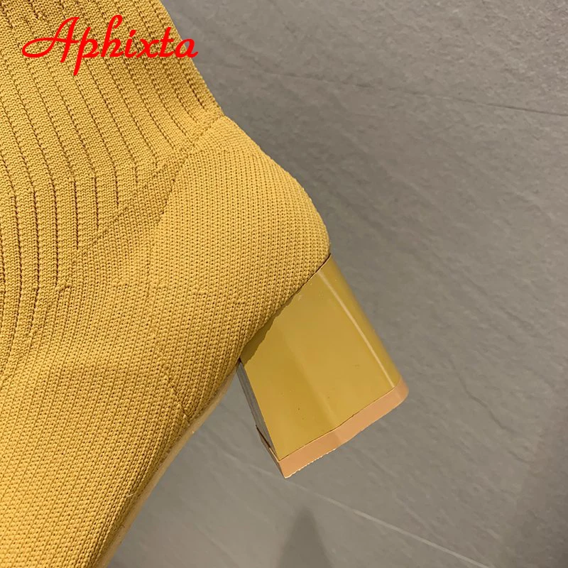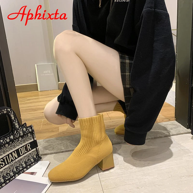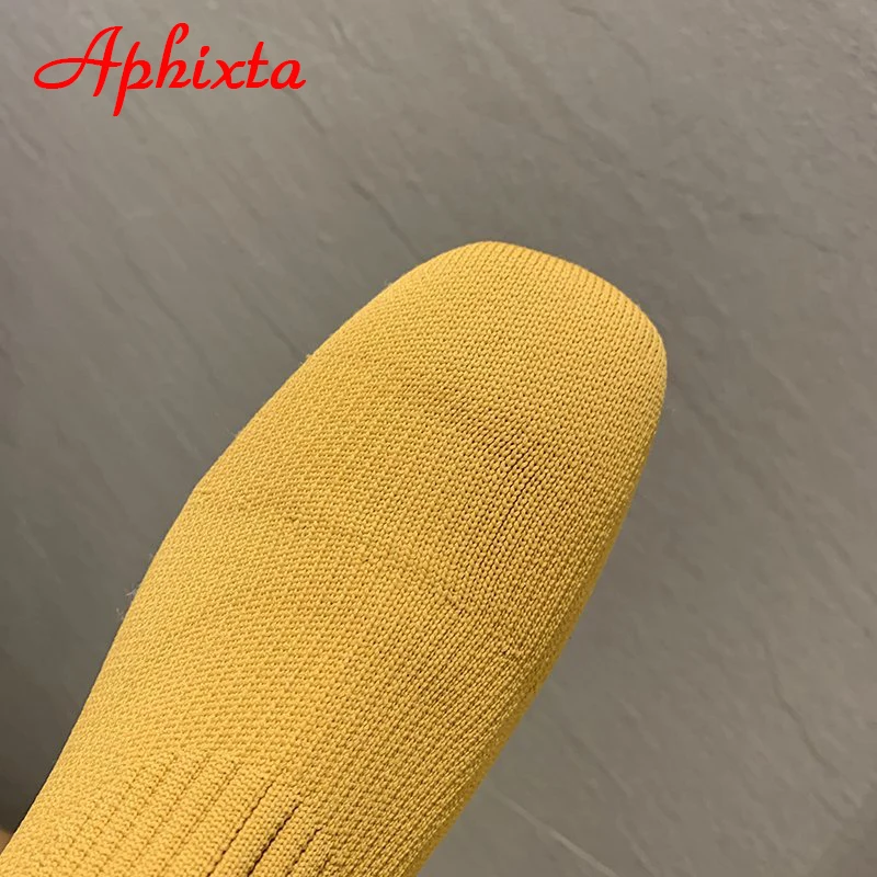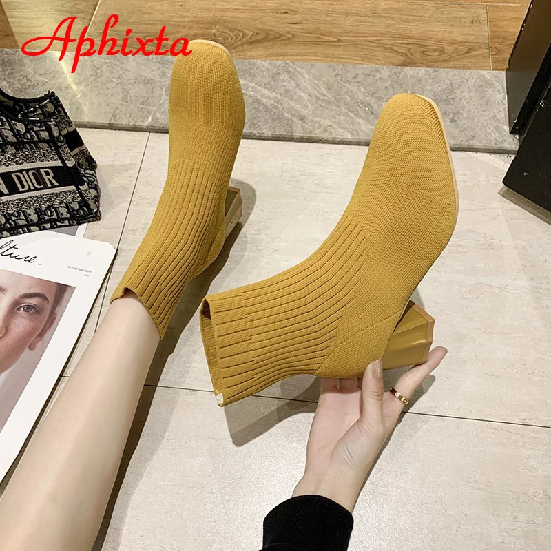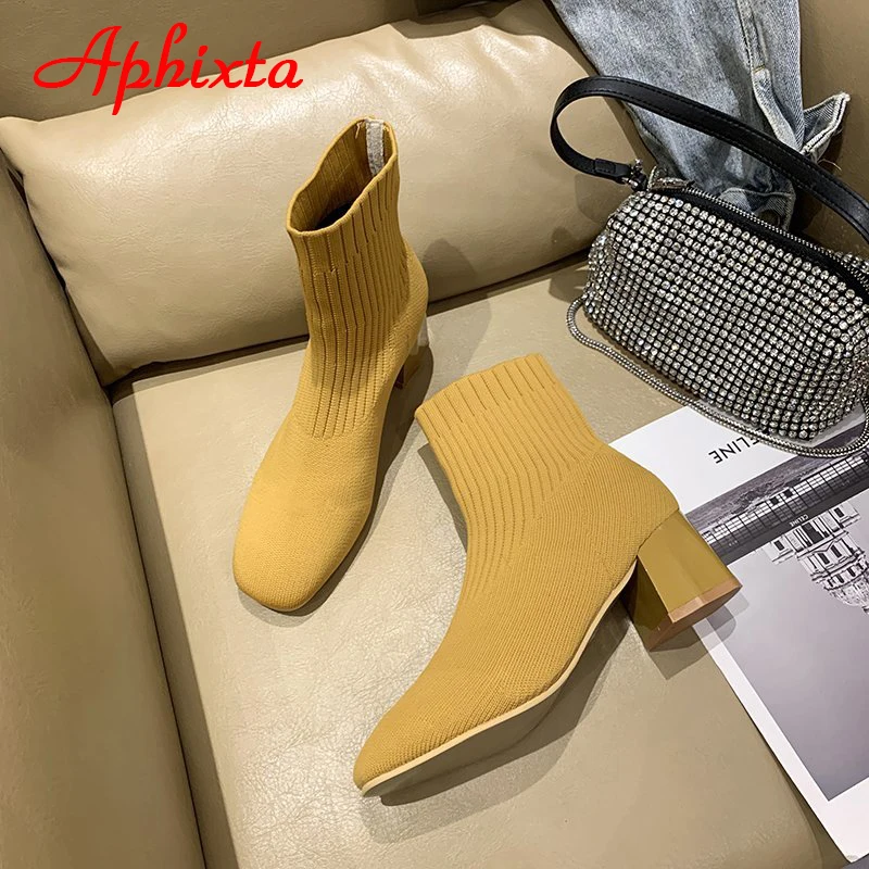 Женские сапоги-носок Aphixta, из эластичной ткани, с квадратным каблуком 5,5 см, вязаная обувь желтого цвета, хлопковые сапоги, женская обувь