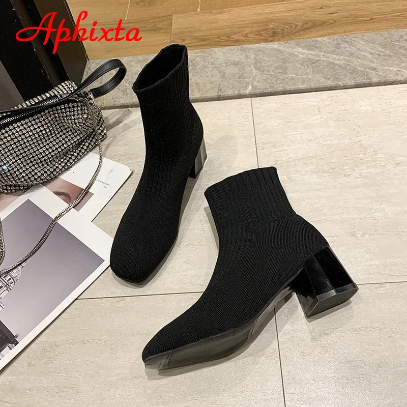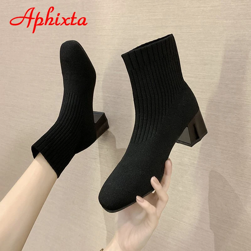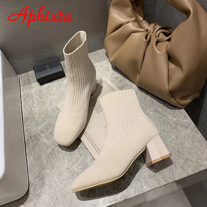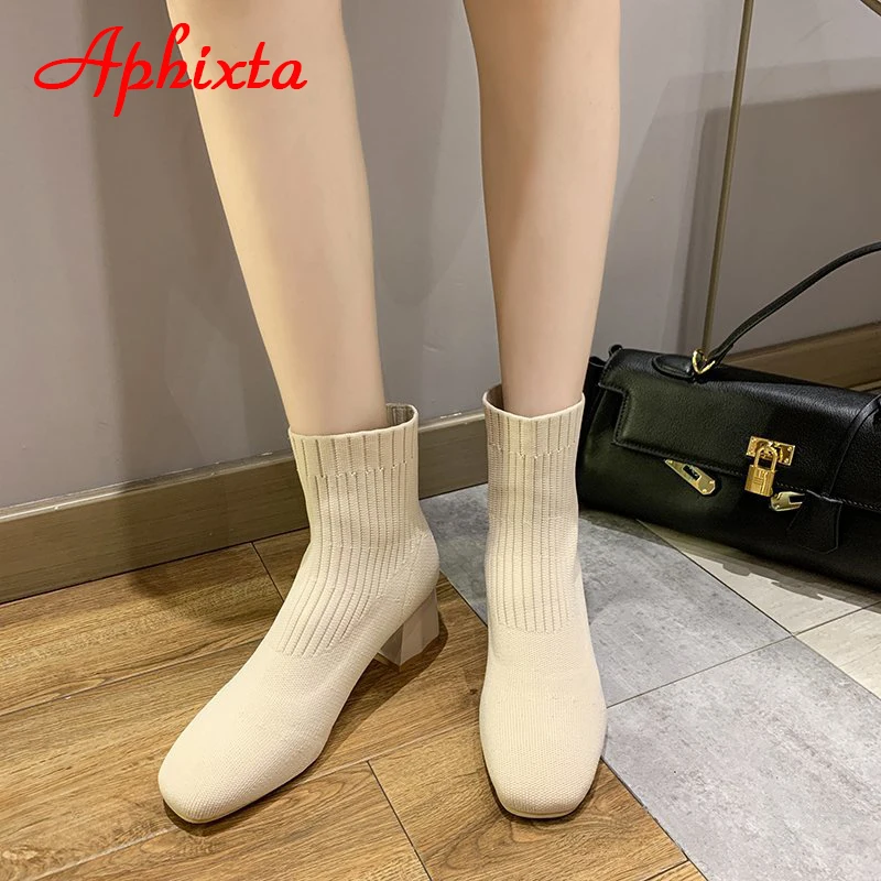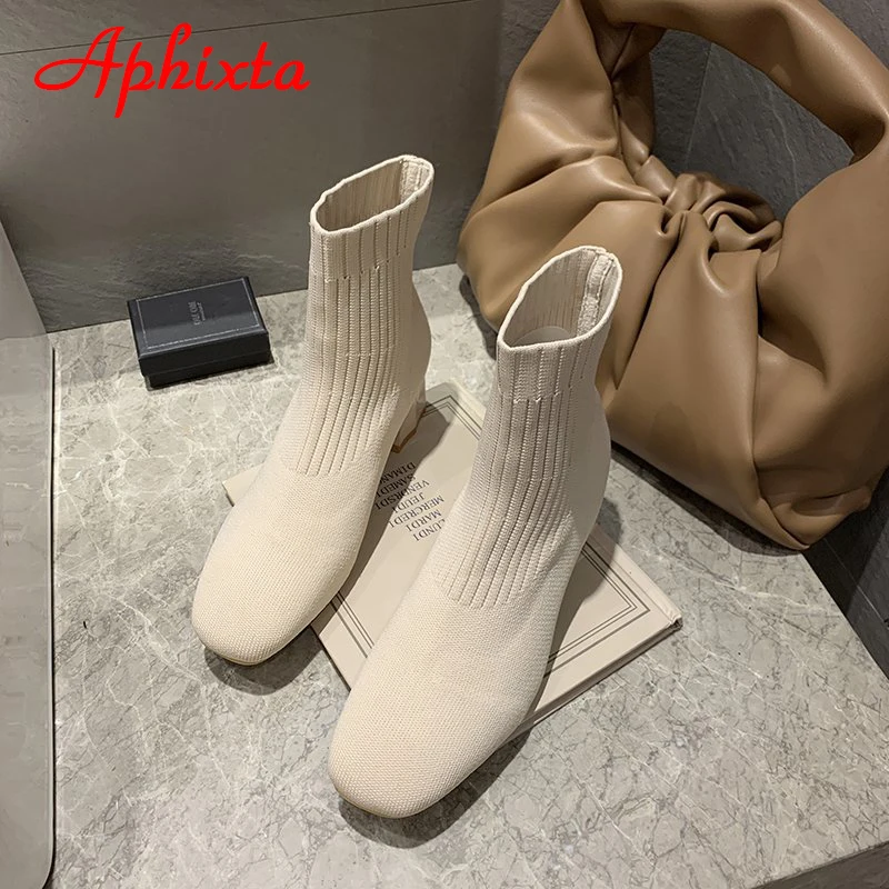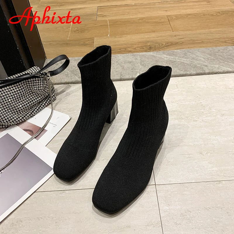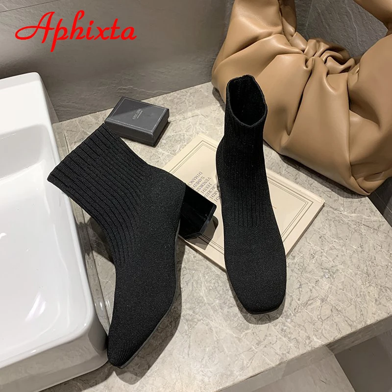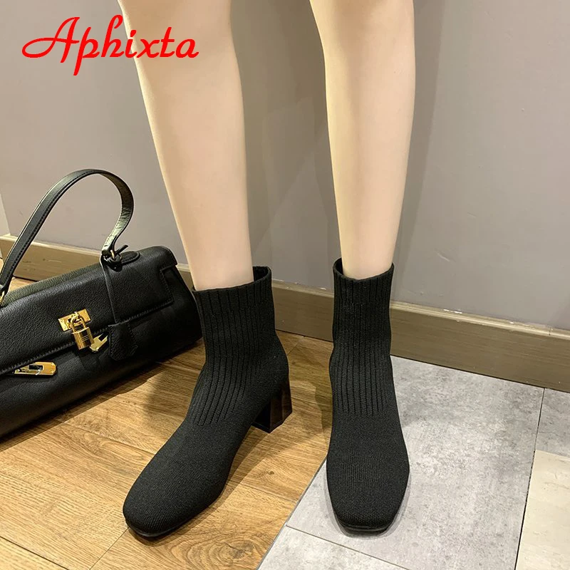 Женские сапоги-носок Aphixta, из эластичной ткани, с квадратным каблуком 5,5 см, вязаная обувь желтого цвета, хлопковые сапоги, женская обувь