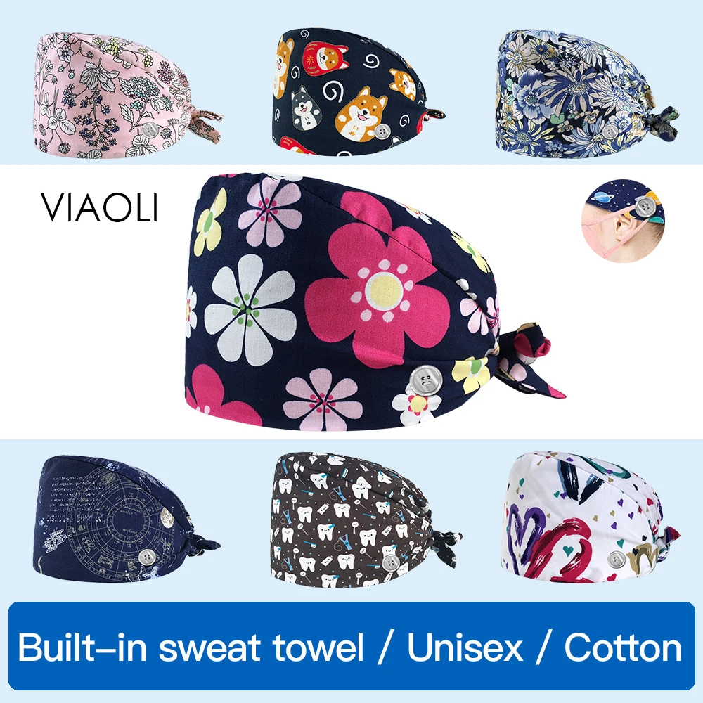 Viaoli, новинка, мужские и женские, высокое качество, с мультяшным принтом, дышащий хлопок, регулируемые скрабы, кепка на пуговицах, рабочие шапки, Scrub Cap