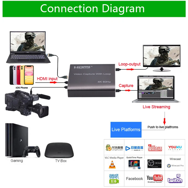 Тип подключения и Управление1: подключите источник сигнала UHD к входу HDMI для видеозахвата с помощью одного HDMIКабель.2. Подключите устройство отображения к выходу HDMI видеозахвата с помощью одного кабеля HDMI.3. Подключите usb-порт ПК к usb-выходу видеозахвата с помощью одного usb-кабеля.4: шаги по эксплуатации для видеозахвата USB (OBS): Откройте программное обеспечение → выберите источники«Устройство видеозахвата» → Установите Размер image→ выберите «режим студии» (двойное окно)→ Выберите «начать запись».