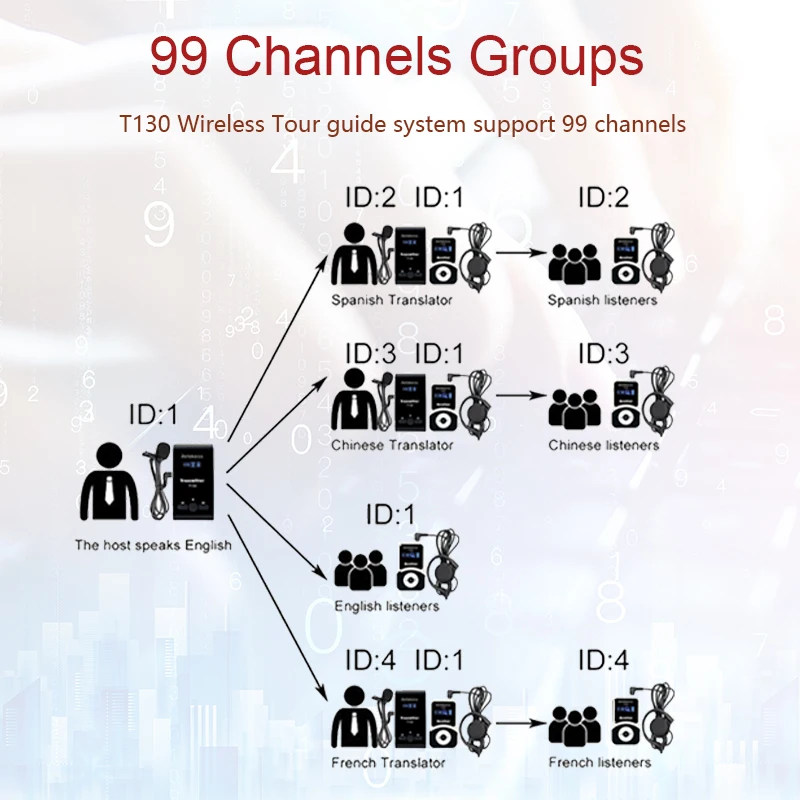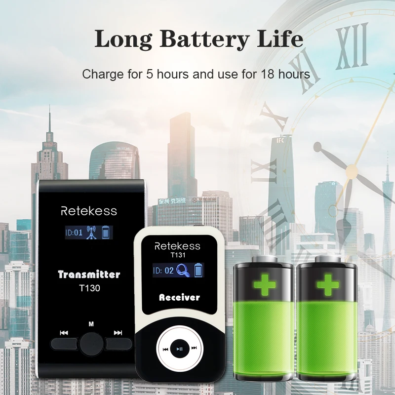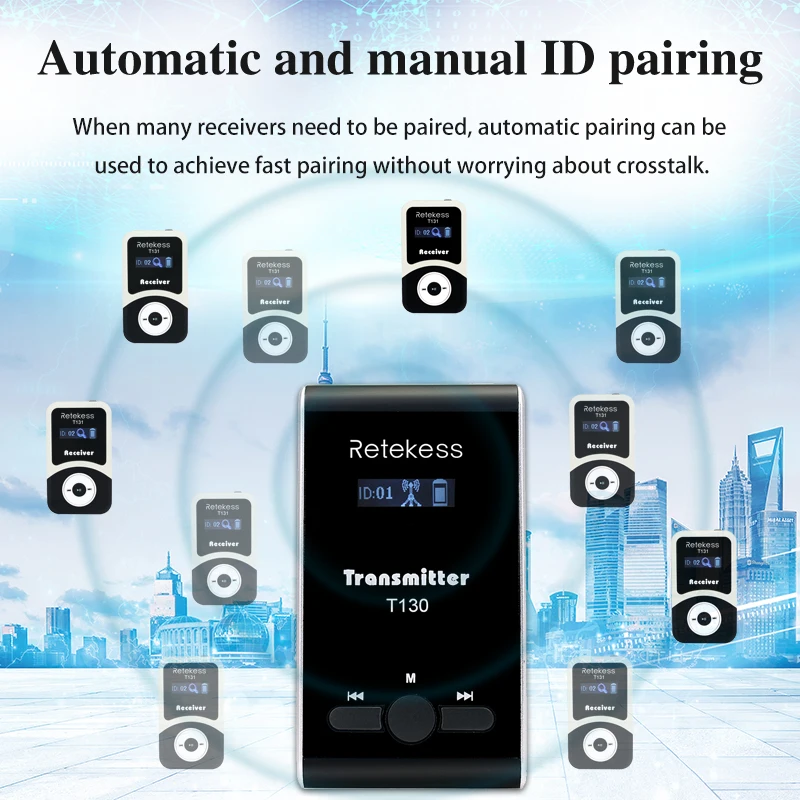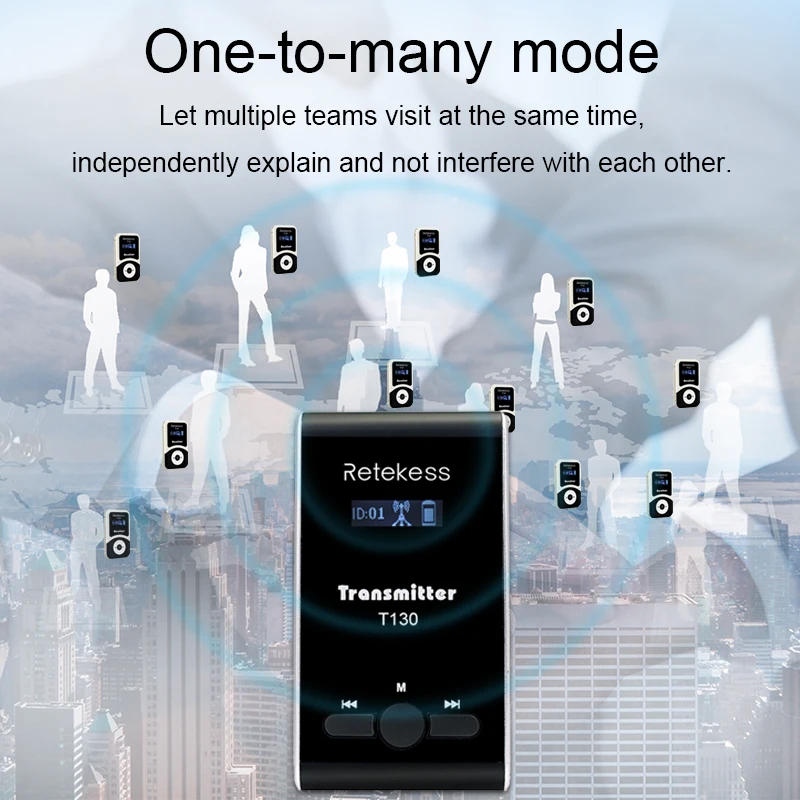 5. Система экскурсоводов Retekess T130 и Retekess T131 имеет 99 каналов (ID): каждый канал (ID) имеет разную частоту, поэтому можно использовать 99 групповых систем гидов (каждая группа использует свой идентификатор) в одном месте. Эти 99 групп не будем мешать друг другу.