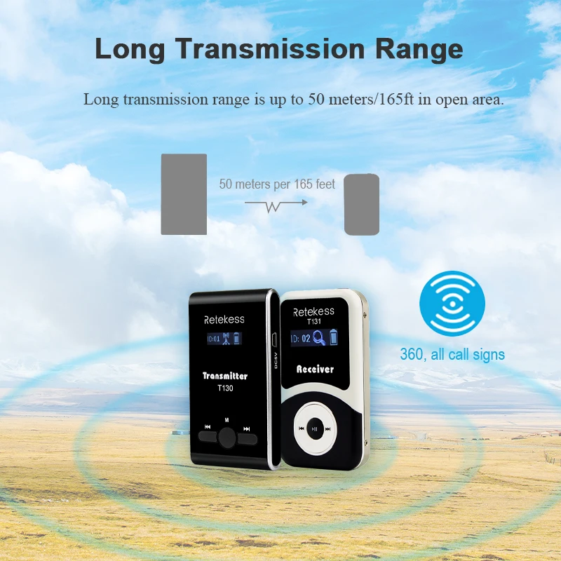 3. Рабочий диапазон:Рабочий диапазон Retekess T130 / T131 составляет до 50 метров на открытой местности. Убедитесь, что передатчик и приемники находятся в безбарьерной среде передачи.