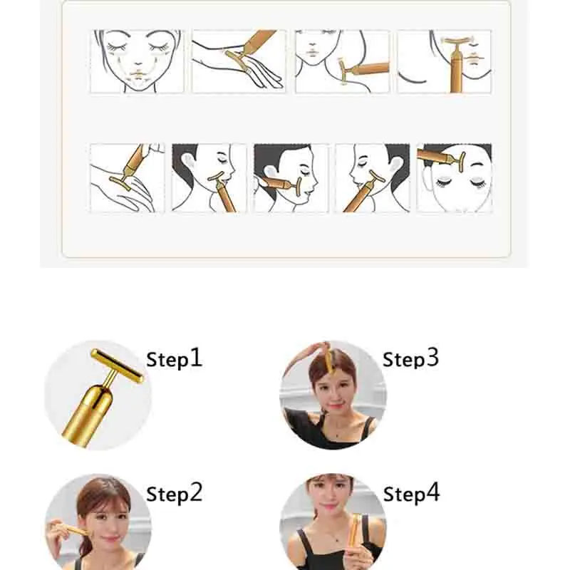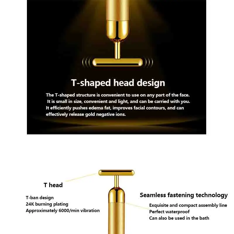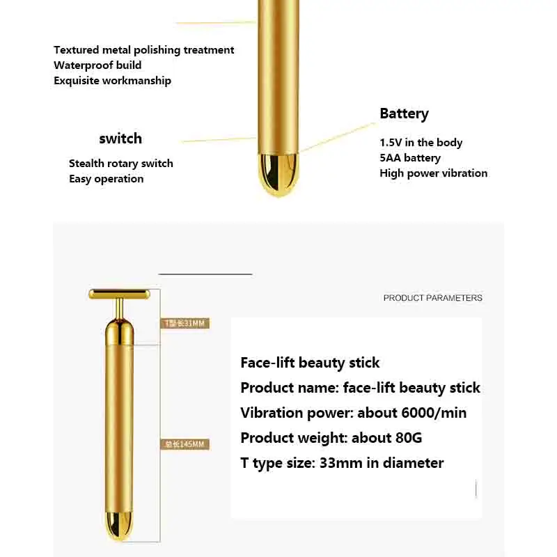 Особенности: Название продукта: Косметическая палка для подтяжки лица Мощность вибрации: около 6000/мин Вес изделия: около 67 г Размер T: 33 мм в диаметре Размер нетто: 34*18*145 мм Мощность использования: DC1.5V Источник питания: батарея AA Время непрерывного использования:> 2 ч Материал: сплав Дизайн с Т-образной головкой T-образная структура удобна в использовании на любой части лица. Он маленький, удобный, светильник, который можно носить с собой. Он эффективно способствует разбуханию жира, улучшает контуры лица и эффективно выделяет отрицательные ионы золота. Т-образная головка: Т-образный дизайн, плакировка 24K, около 6000/мин вибрации Технология бесшовного крепления: Изысканная и компактная сборочная линия, идеальная водонепроницаемая, также может использоваться в ванной комнате Полированная Металлическая текстура, водонепроницаемая и тонкая работа Внутренний 1,5 V, 5AA батарея, вибрации наивысшей мощности