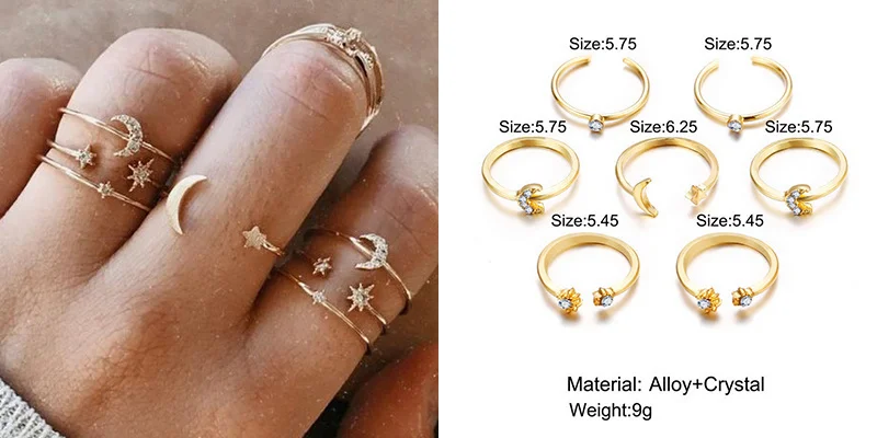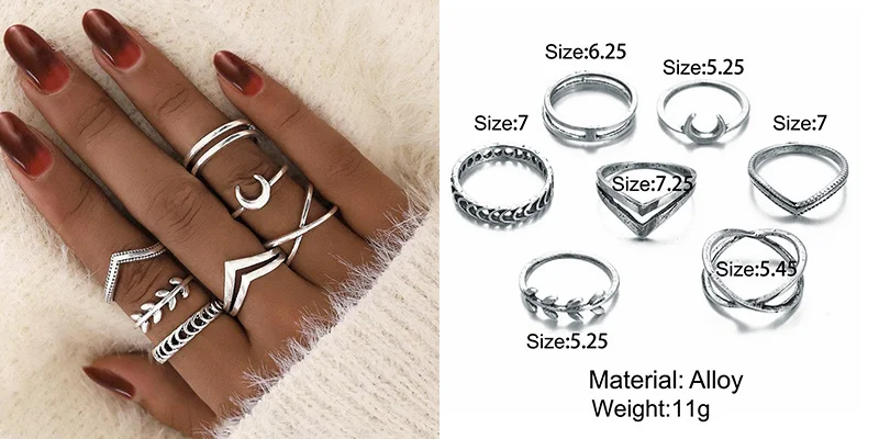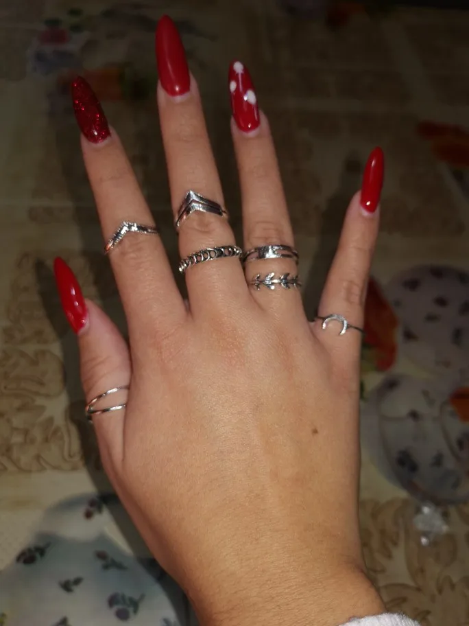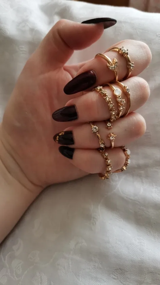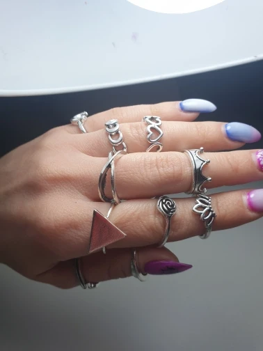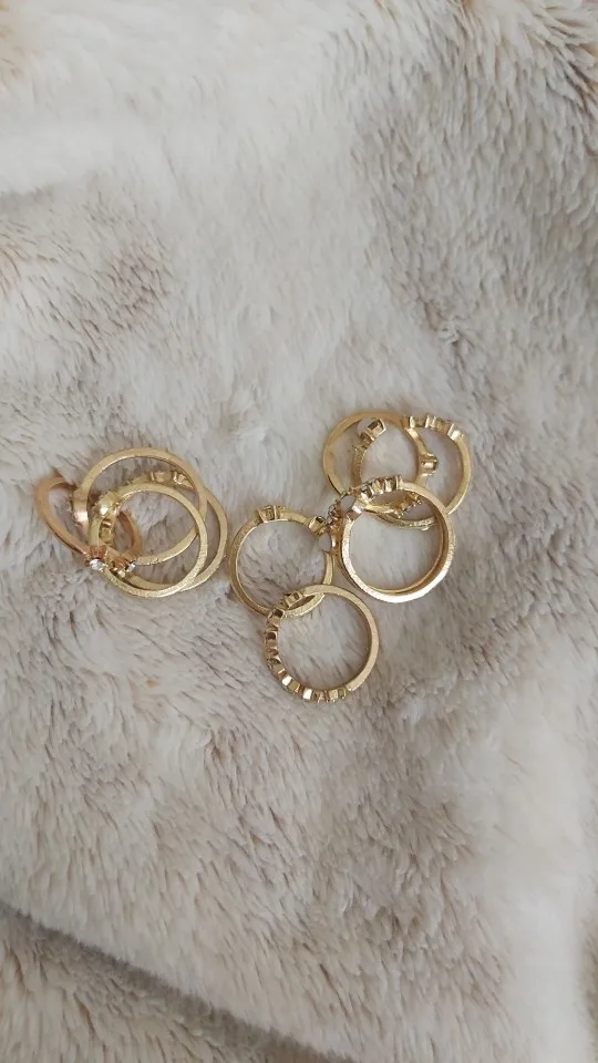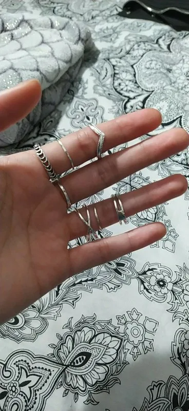 За такую цену - нормальное качество. Металл не блестящий, что очень хорошо. Кольца без камней выглядят почти как на картинке. Насчёт размеров: абсолютно все самые маленькие кольца как раз или большие на безымянный палец (он у меня 15,5 наш размер). На фалангах удобно только 2-3 варианта носить. Большой минус: кольца с камнем, особенно, самое большое. Криво приклеено, ярко-синий кусок пластика. Выкину его или попробую приклеить другой камень.