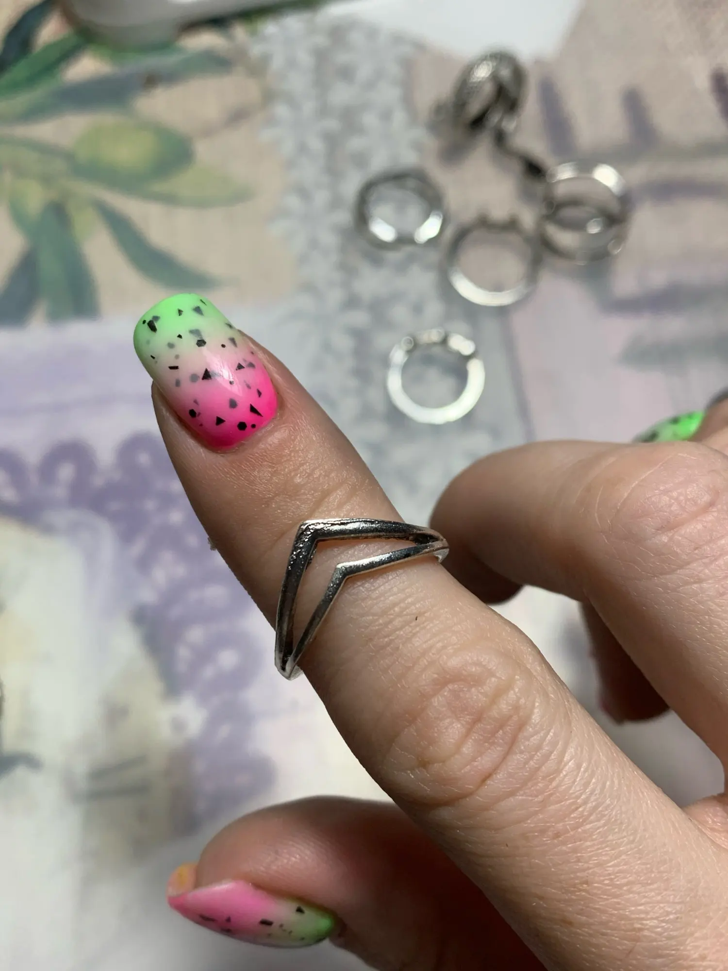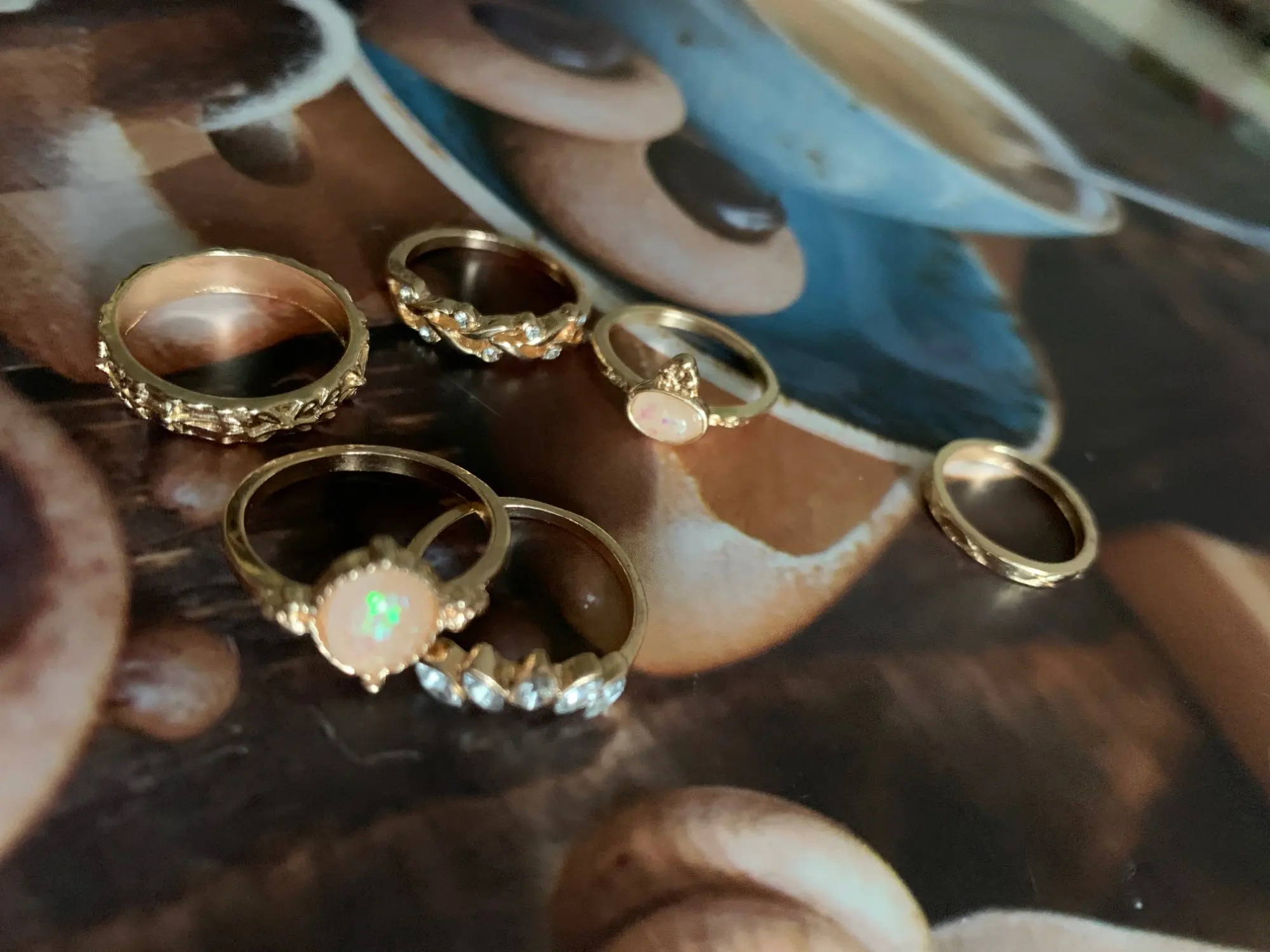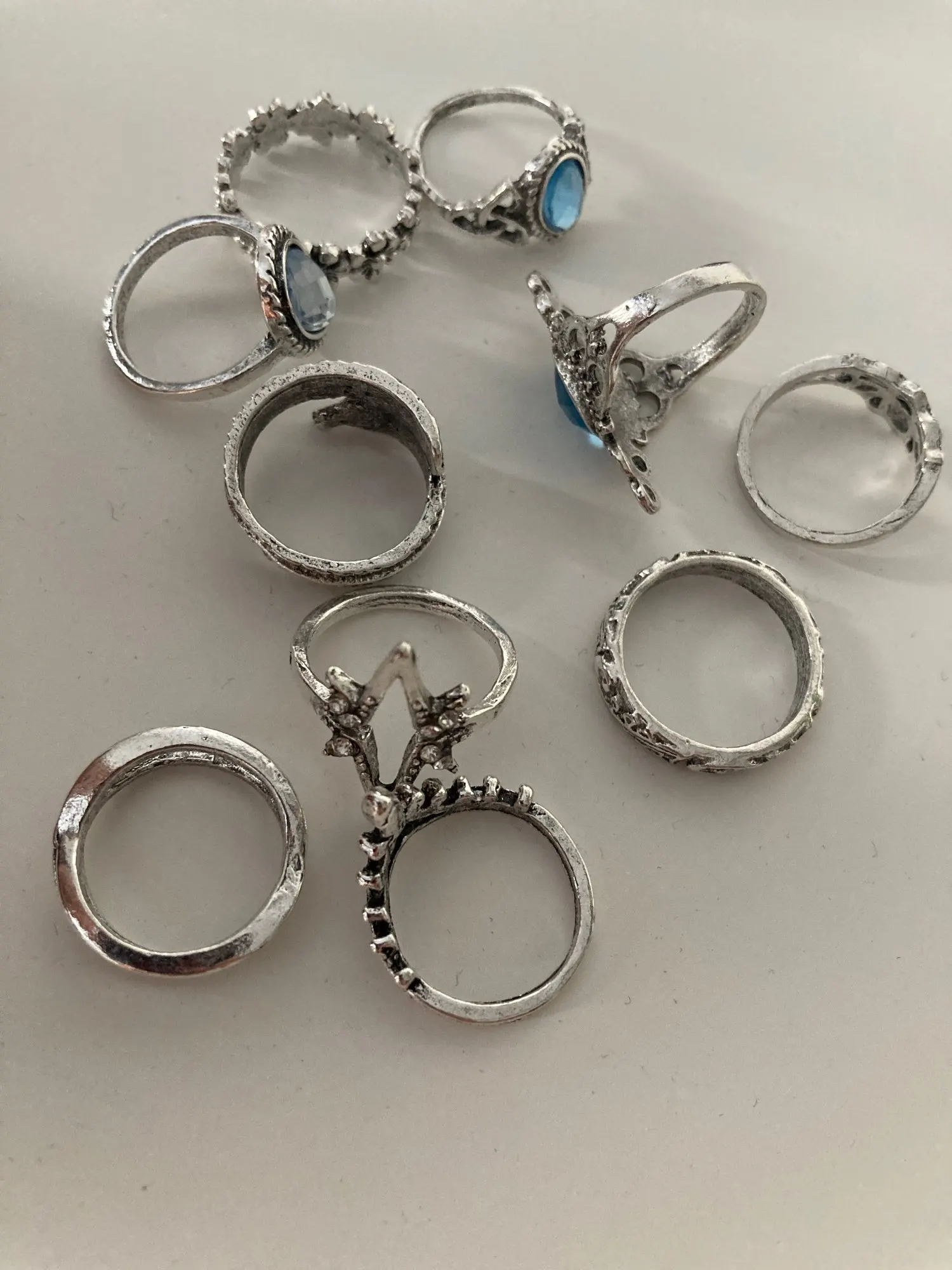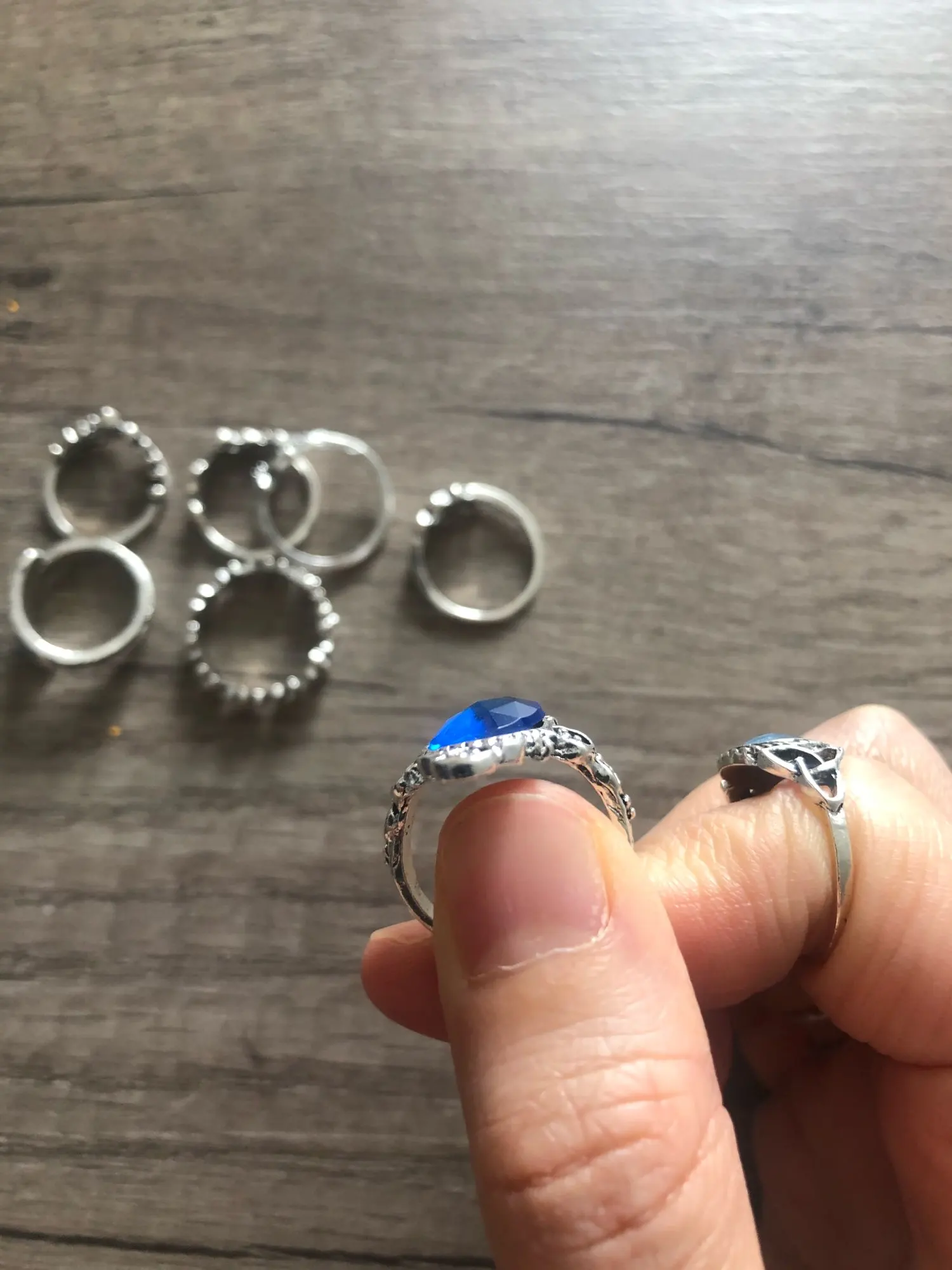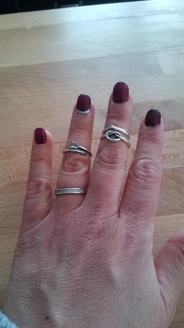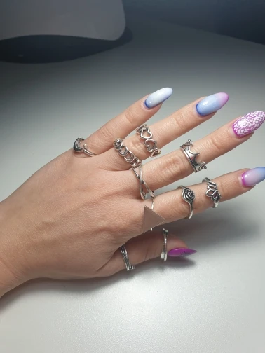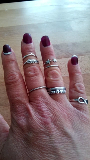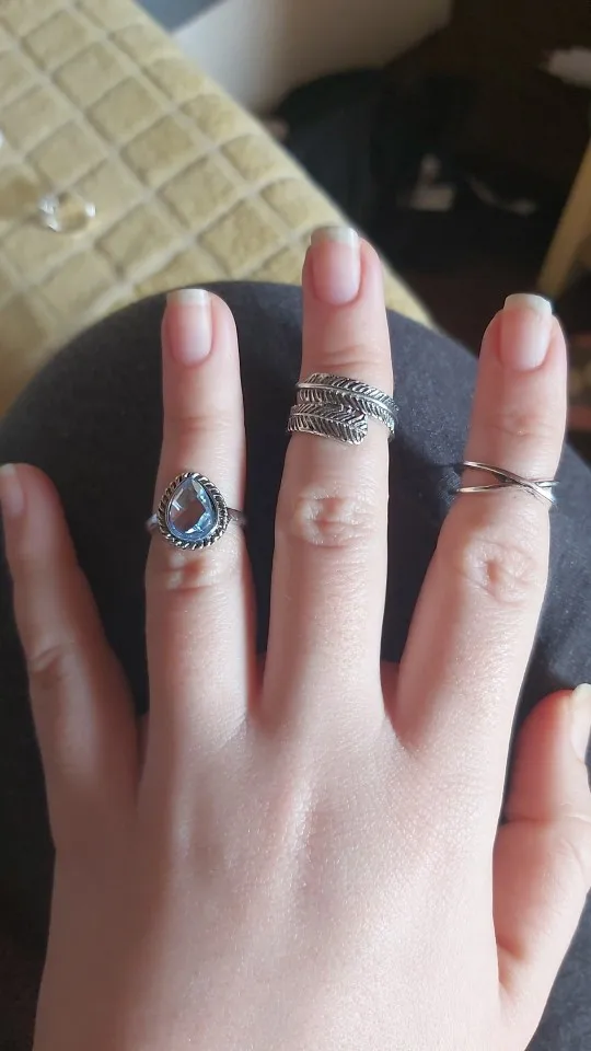 super jolies bagues! très fancy je recommande ! Une est arrivée cassée mais j'ai pu la recoller. attention il faut mettre du vernis transparent dessus sinon elles déteignent sur les doigts et laissent des traces bleues et les bagues deviennent brunes! ;)